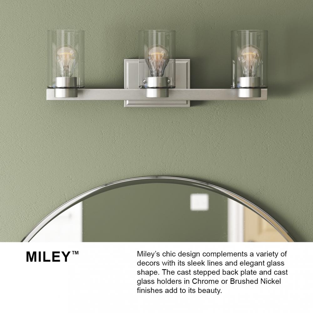 Miley's chic design complements a variety of décors with its sleek lines and elegant glass shape. The cast stepped back plate and cast glass holders in Chrome or Brushed Nickel finishes add to its beauty.