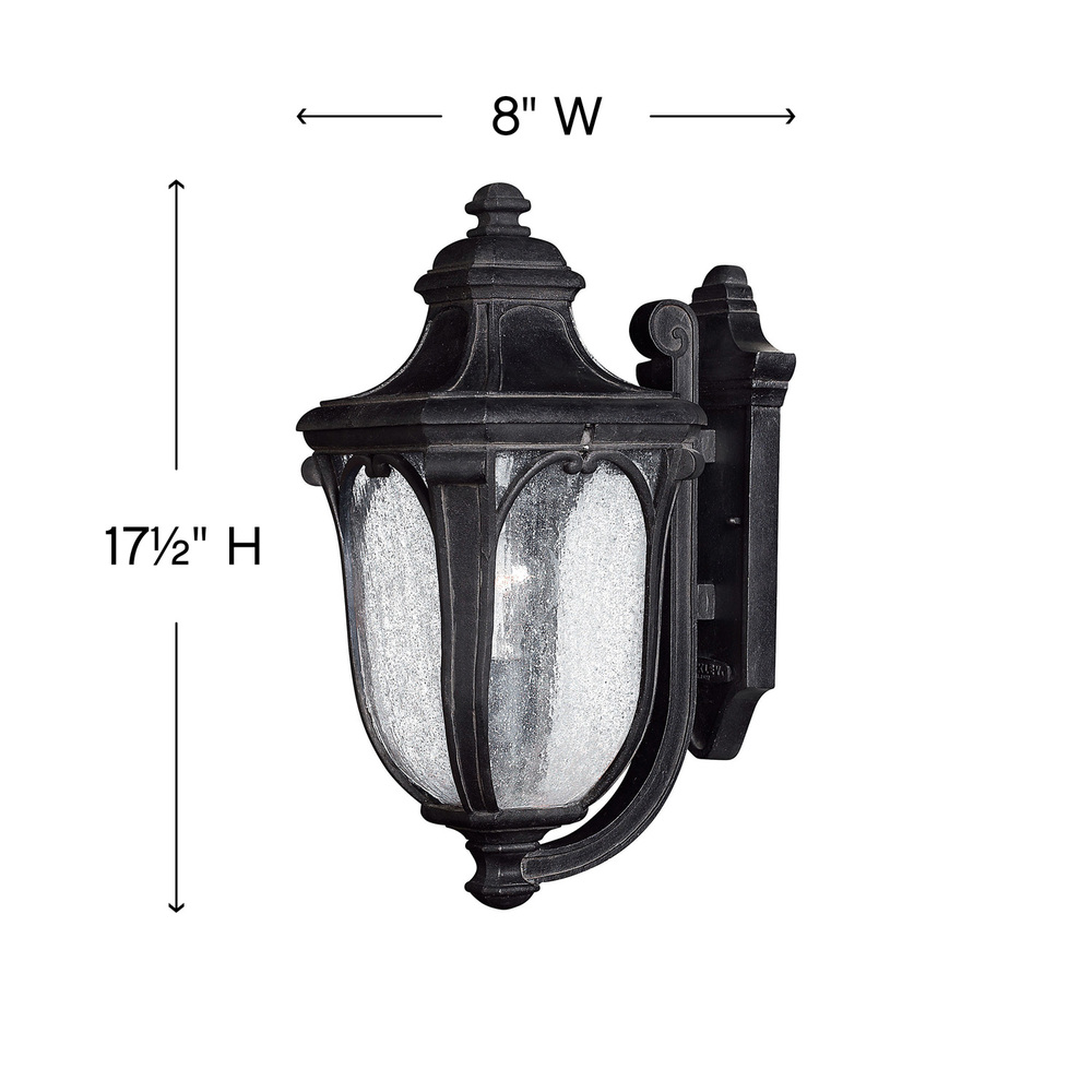 Trafalgar’s grand design in sturdy cast aluminum adds historical flair with delicate scroll arch detail, authentic distressed finish and clear seedy glass.