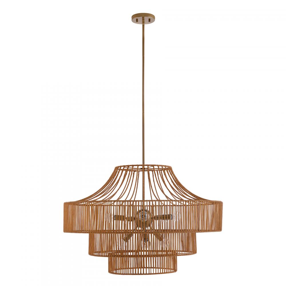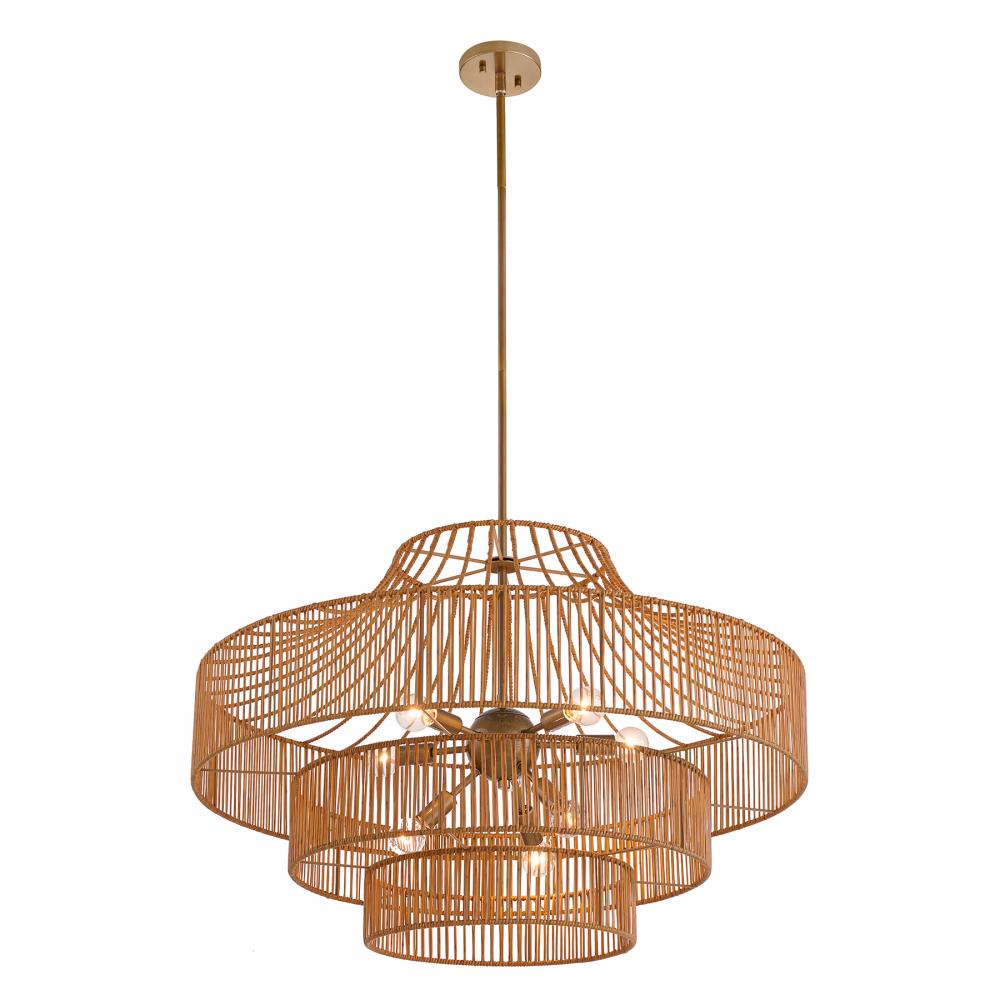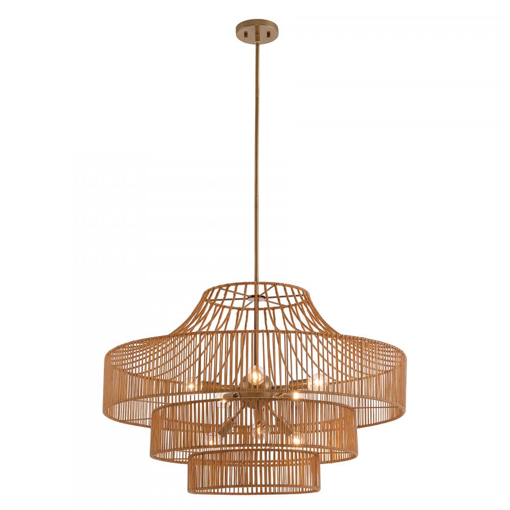 Savoy House brings the natural beauty of rattan lighting to the great outdoors with the Medlock 8-light garden chandelier. A multi-tiered rattan resin shade creates touchable, eye-catching texture while the Burnished Brass finish adds boldness. Medlock is 22" in height and 32" in width. Uses eight candelabra size bulbs of up to 40 watts per bulb. Bulbs not included. Medlock is damp area rated and can also be used indoors.