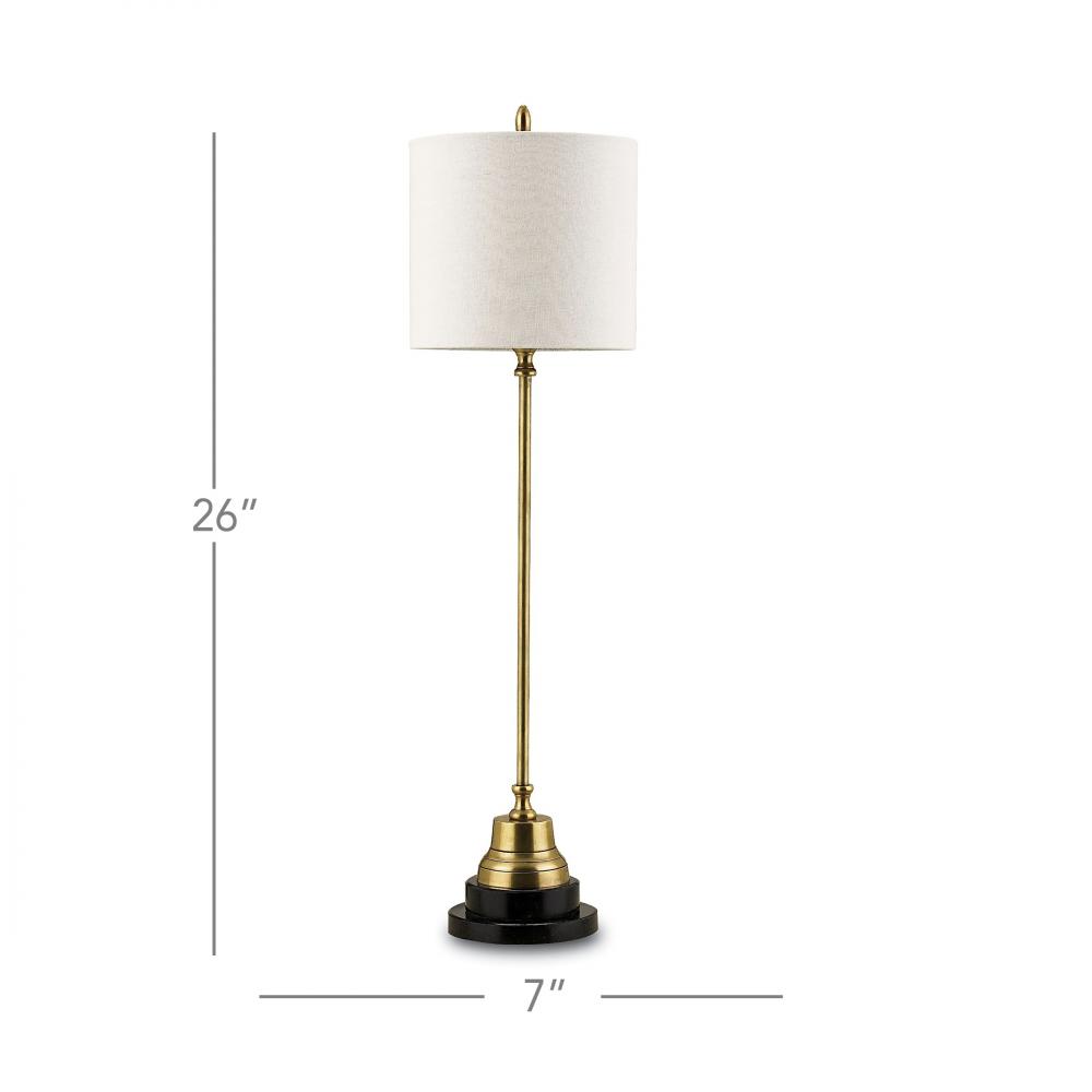 Contributing to the enduring style of the Messenger Brass Table Lamp is the vintage brass finish on its slender stem, finial, and detail above the stacked black granite base. The gold lamp has a perfectly proportioned bone linen shade.