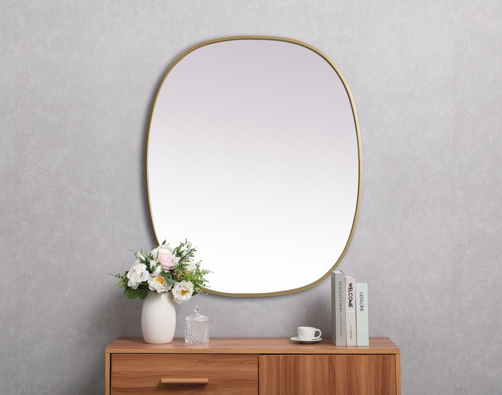Crafted of metal, this mirror strikes a rounded corner silhouette. Instantly open up any space in your home with this minimalist wall-mounted mirror. Its slender, clean-lined frame sports a classic finish, while the glass mirror within features a flat, for a brilliant reflection, letting the light bounce off to expand your space. Designed in an oblong shape, this metal-frame mirror showcases in the three available satin finishes in black, brass, or silver. Mount this work of art in any room of your choice for added visual impact.