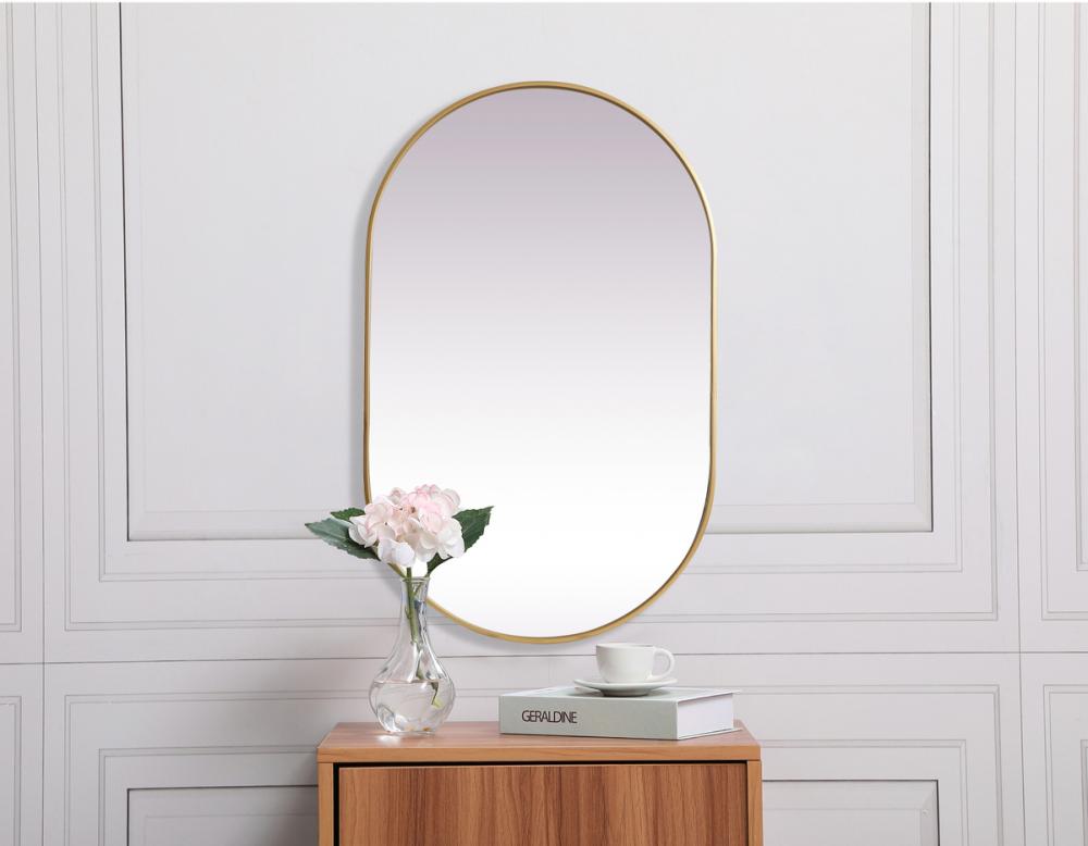 Instantly open up any space in your home with this minimalist wall-mounted mirror. Crafted of metal, this mirror strikes a pill-shaped silhouette. Its slender, clean-lined frame sports a classic finish, while the glass mirror within features a flat, for a brilliant reflection, letting the light bounce off to expand your space. Designed in a pill shape, this metal-frame mirror showcases in the three available satin finishes in black, brass, or silver. Mount this work of art in any room of your choice for added visual impact.