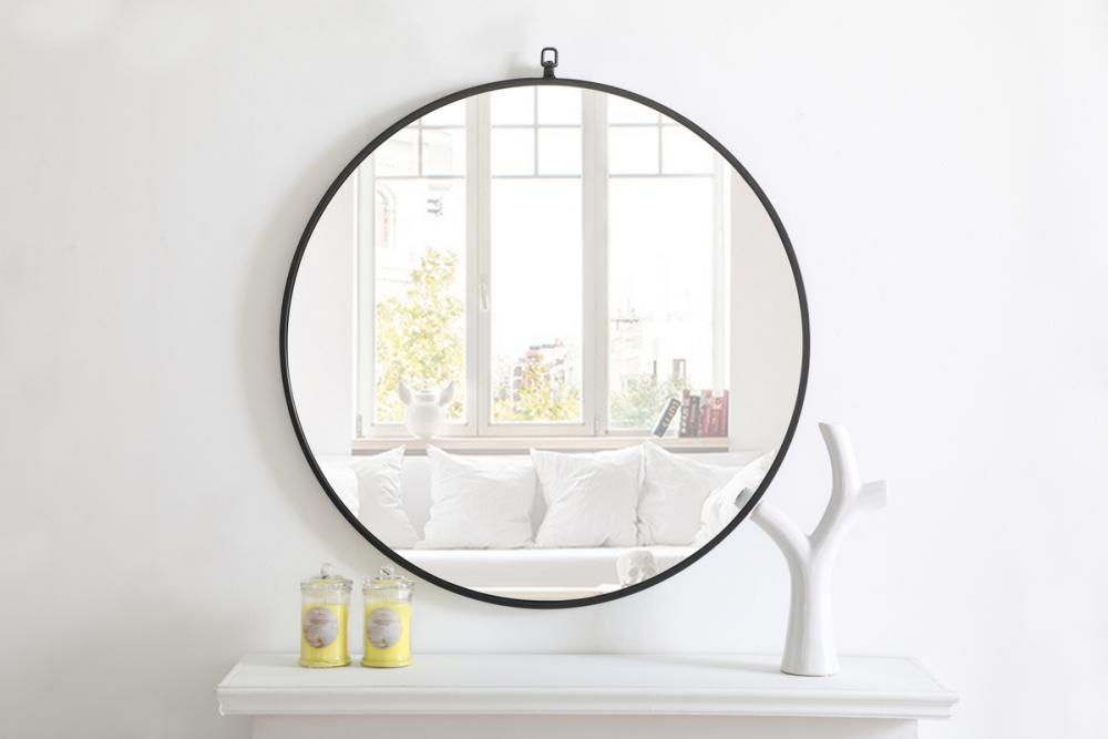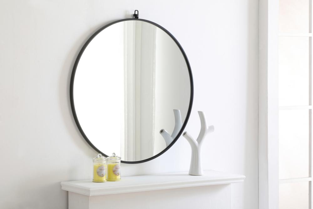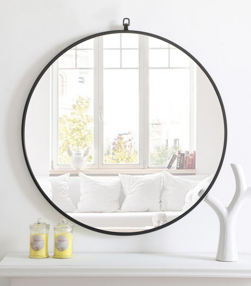 Enhance the appeal of your home or office with this contemporary black mirror featuring a thin rounded metal edges in a deep profile, reflecting a minimalist's design and trendy styling. To ensure your home safety, we use a metal hanger ring that are securely welded to the back of the metal frame , which sit on top of the frame for easy hanging. We recommend using suitable heavy duty picture/mirror hooks, selecting the best type of fixing for the particular wall you wish to hang the mirror on, using the appropriate rawl plug if required. Measurement: D32.