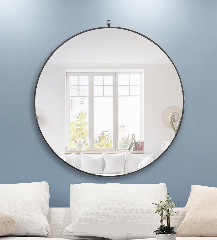 Enhance the appeal of your home or office with this black contemporary mirror featuring a thin rounded metal edges in a deep profile, reflecting a minimalist's design and trendy styling. To ensure your home safety, we use a metal hanger ring that are securely welded to the back of the metal frame , which sit on top of the frame for easy hanging. We recommend using suitable heavy duty picture/mirror hooks, selecting the best type of fixing for the particular wall you wish to hang the mirror on, using the appropriate rawl plug if required.