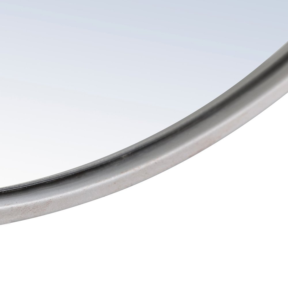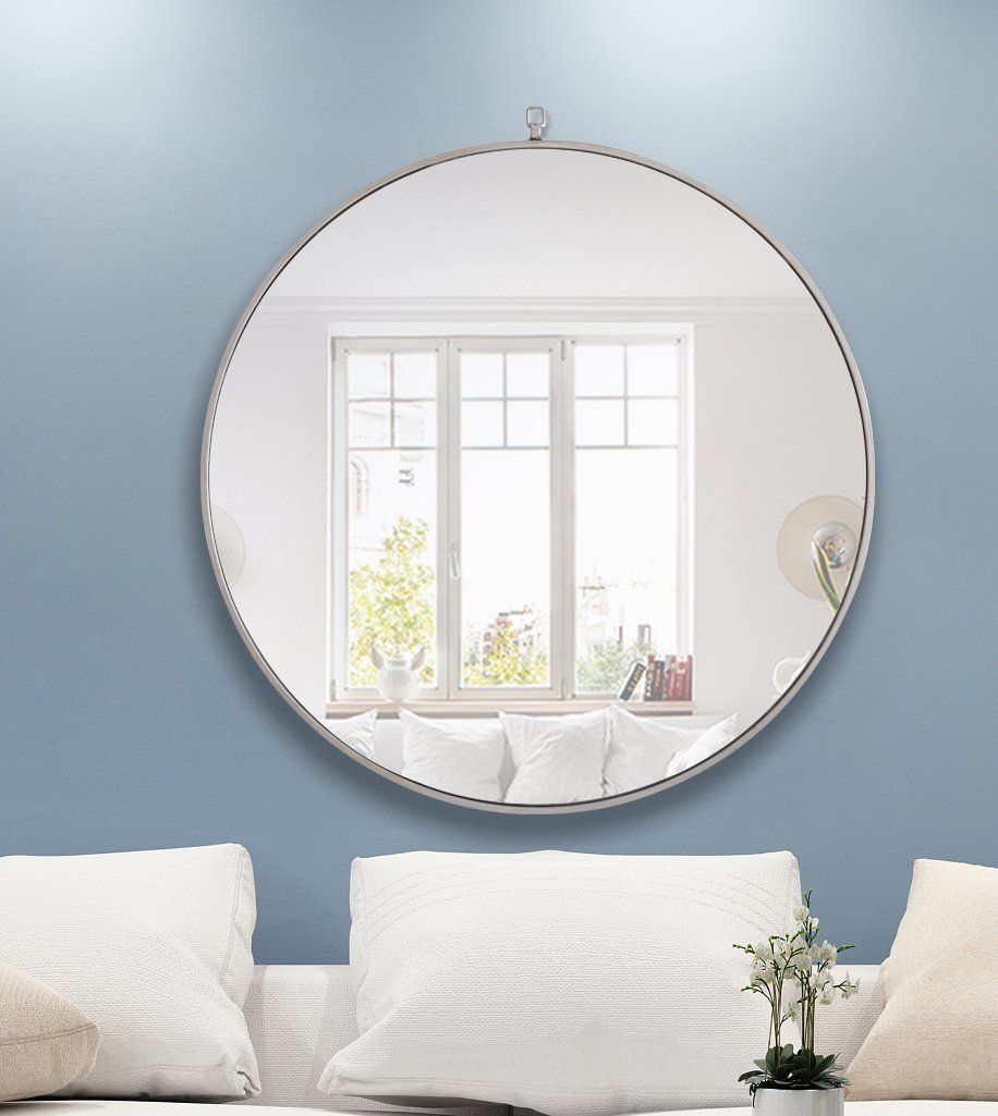 Enhance the appeal of your home or office with this contemporary mirror in silver finish, slightly antiqued, featuring a thin rounded metal edges in a deep profile, reflecting a minimalist's design and trendy styling. To ensure your home safety, we use a metal hanger ring that are securely welded to the back of the metal frame , which sit on top of the frame for easy hanging. We recommend using suitable heavy duty picture/mirror hooks, selecting the best type of fixing for the particular wall you wish to hang the mirror on, using the appropriate rawl plug if required.
