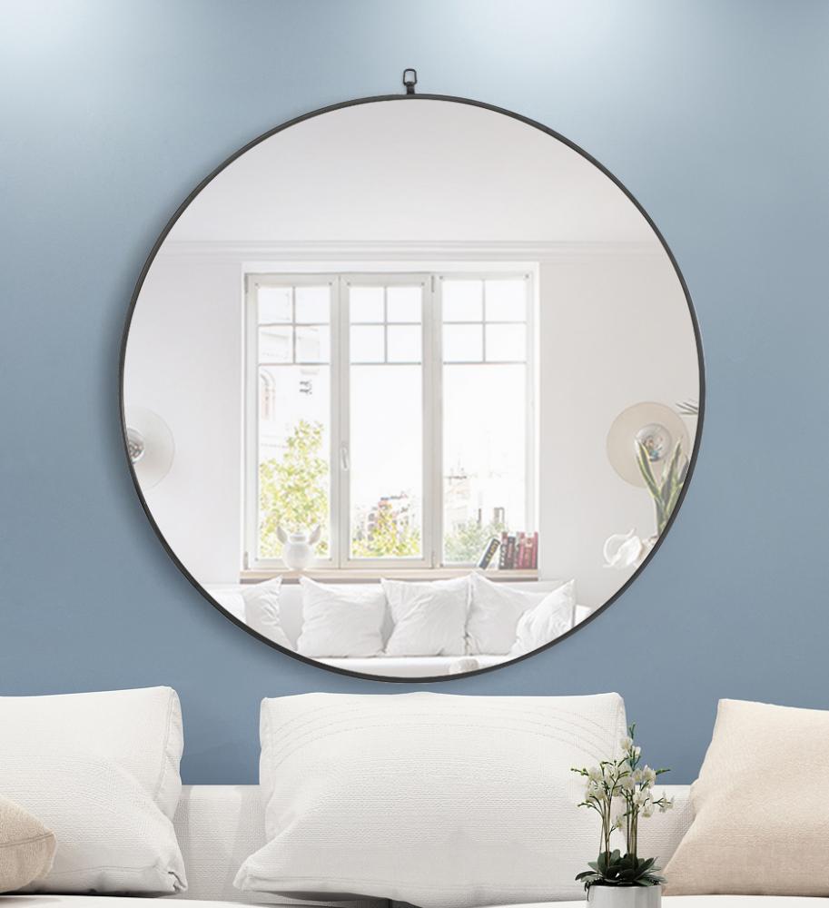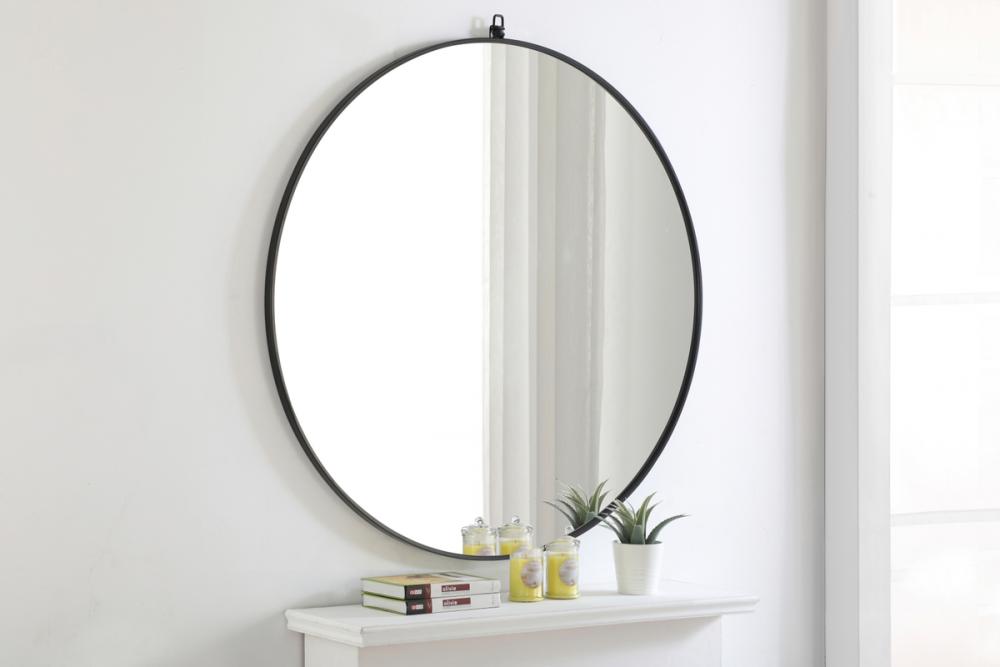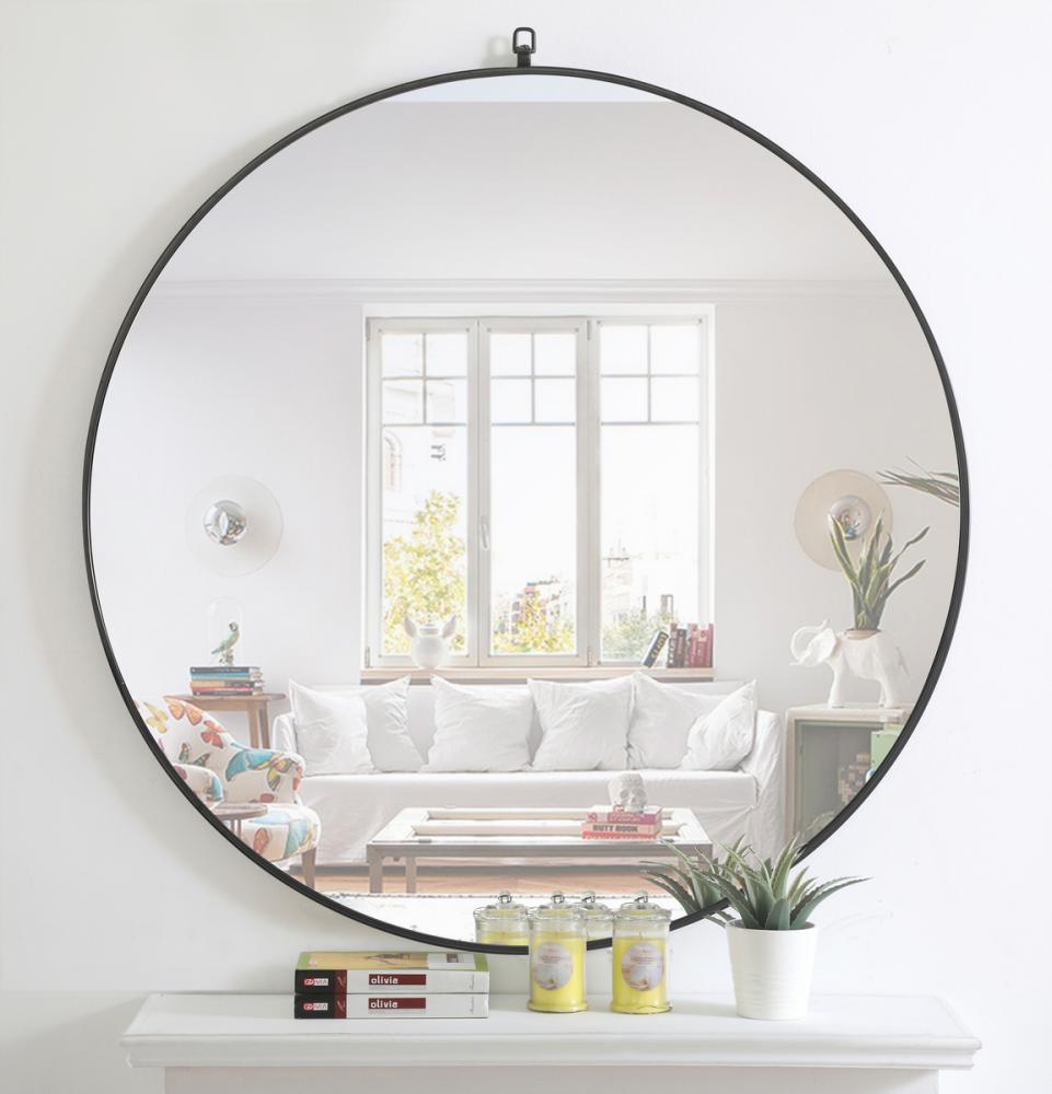 Enhance the appeal of your home or office with this black contemporary mirror featuring a thin rounded metal edges in a deep profile, reflecting a minimalist's design and trendy styling. To ensure your home safety, we use a metal hanger ring that are securely welded to the back of the metal frame , which sit on top of the frame for easy hanging. We recommend using suitable heavy duty picture/mirror hooks, selecting the best type of fixing for the particular wall you wish to hang the mirror on, using the appropriate rawl plug if required. Measurement: D48.