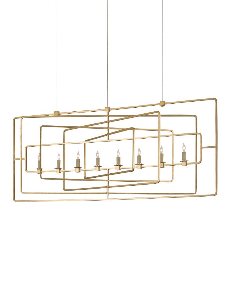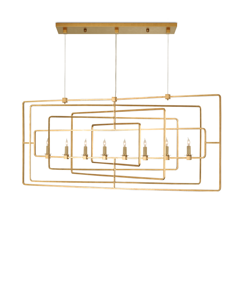 Think Paris International Style, which was all the rage in the 1930s, but with a contemporary new twist and you have a read on the gold version of the Metro Rectangular Chandelier. The elongated linear shape and the interlocking rectangles of the wrought iron that create the frame is a nod to early modernism. The eight-light fixture has been treated to a rich contemporary gold leaf finish. We offer the Metro in a number of other variations.
