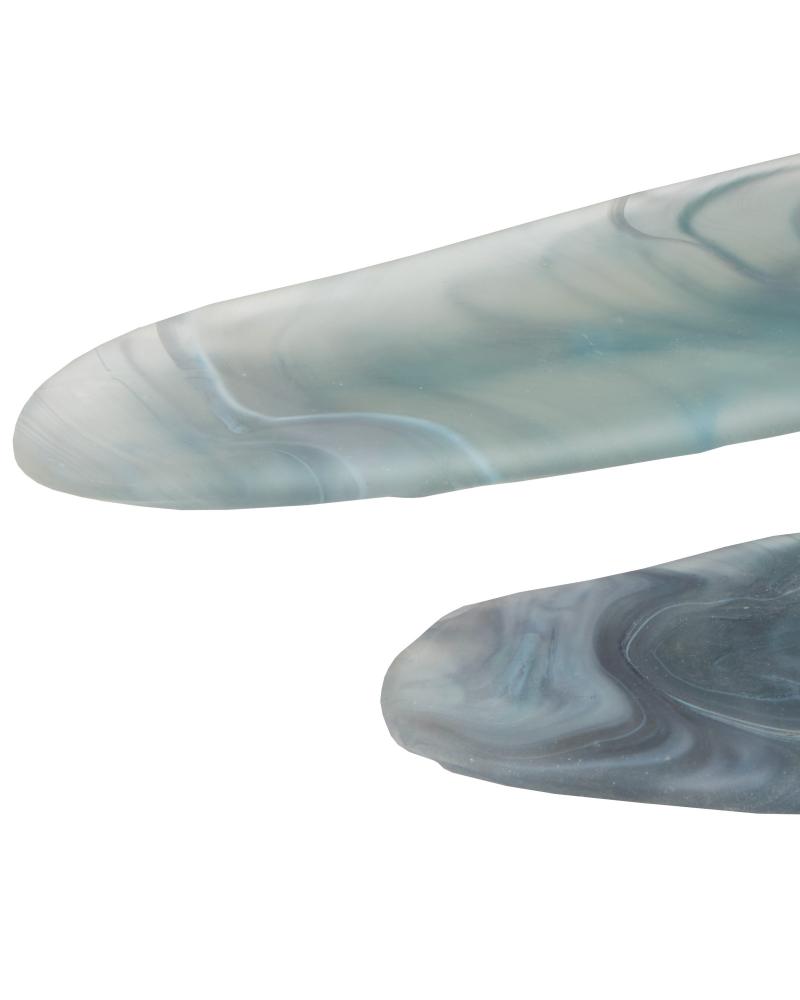 The Midnight Blue Tray Set is a pair of handmade oblong decorative trays created by a glass artist using a very sophisticated mix of white glass and dark blue glass. By swirling the two, the artisan created an effect of billowing storm clouds on these turquoise trays. Use them as elegant desk trays or, if friends are showing up, to hold canapes or finger sandwiches.