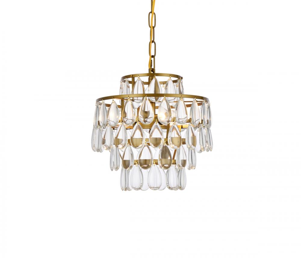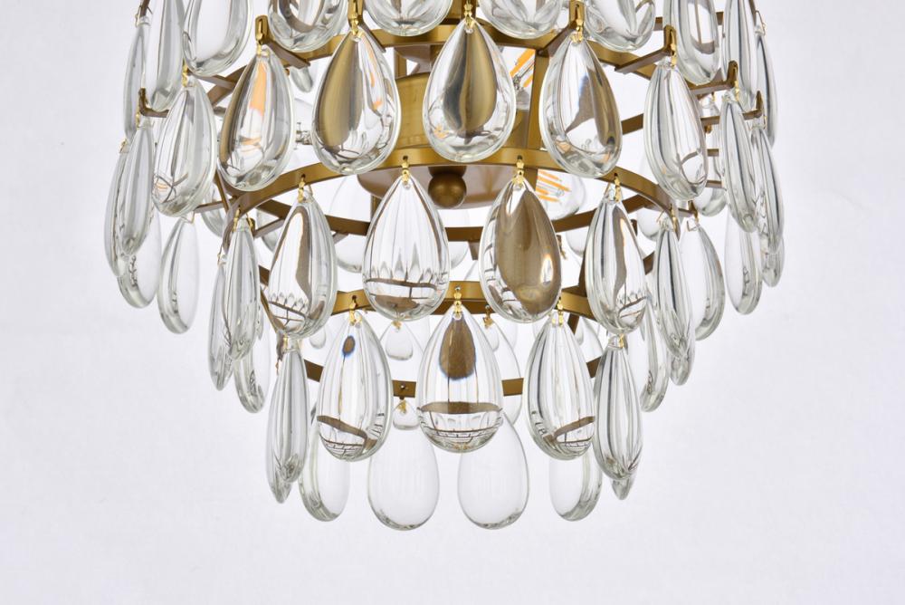 Tiers of clear smooth almond shaped crystals reflect the soft glow of candelabra bulbs