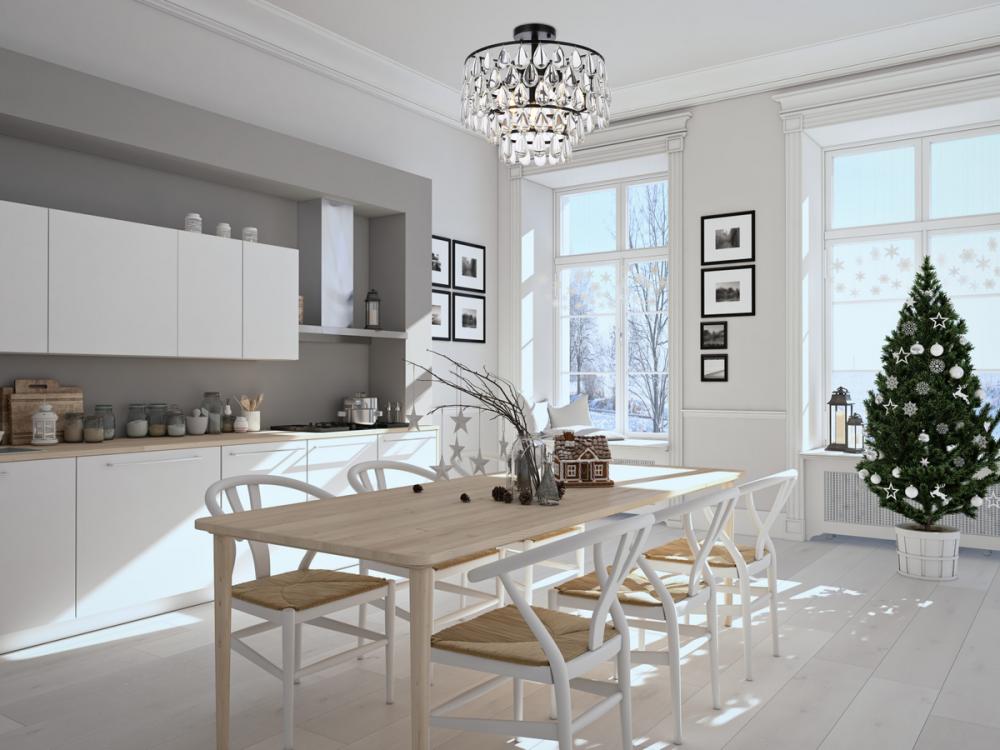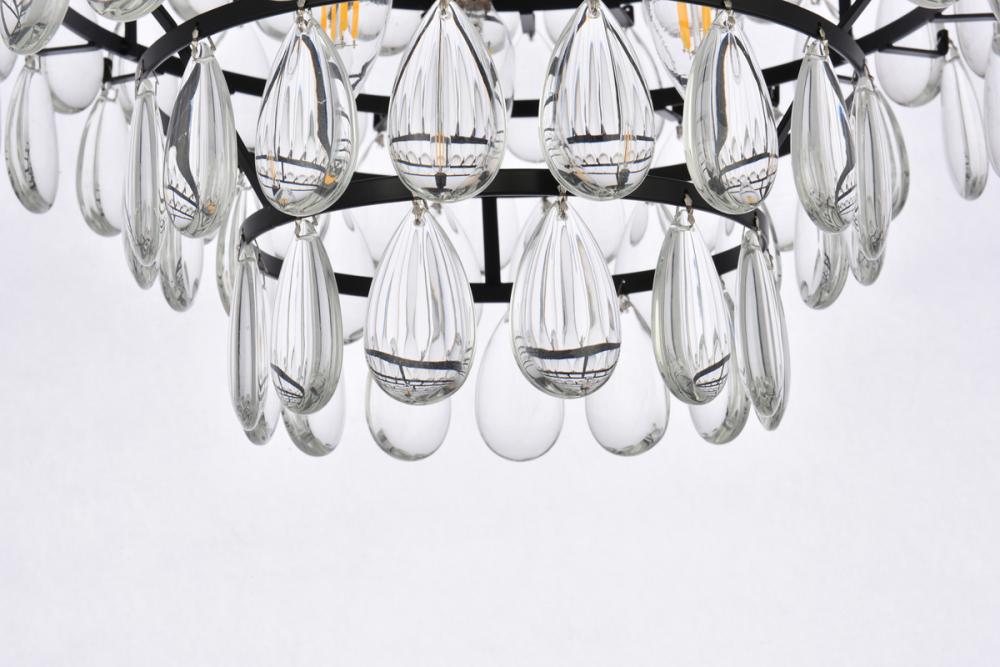Tiers of clear smooth almond shaped crystals reflect the soft glow of candelabra bulbs