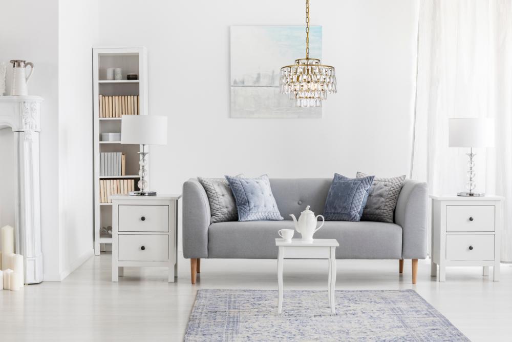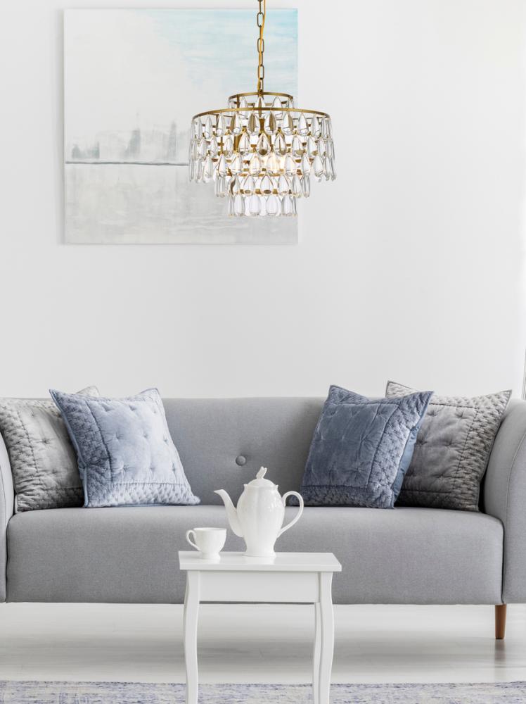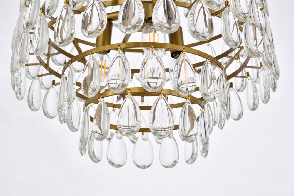 Tiers of clear smooth almond shaped crystals reflect the soft glow of candelabra bulbs