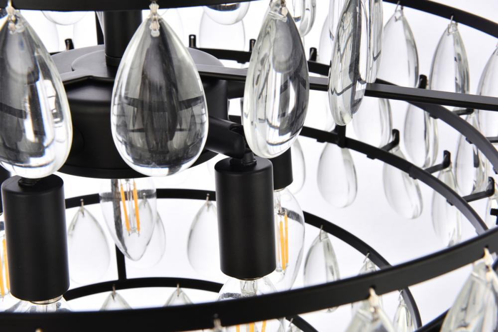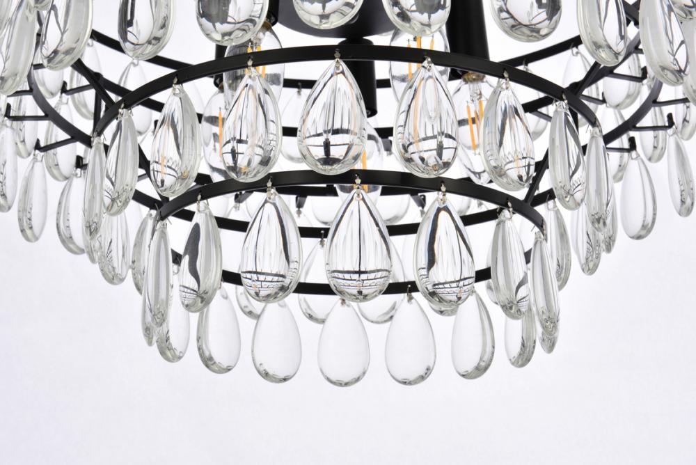 Tiers of clear smooth almond shaped crystals reflect the soft glow of candelabra bulbs