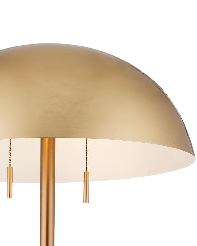 The travertine lamp inspired by other pieces with the same name. The mid-century modern vibe is enhanced by the simple shapes of the lamp's base and body, and the domed brass shade that caps it. Because this beige lamp is made of natural stone, texture and color may vary from lamp to lamp.
