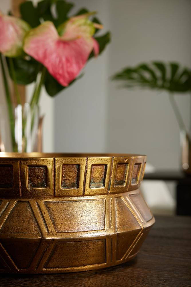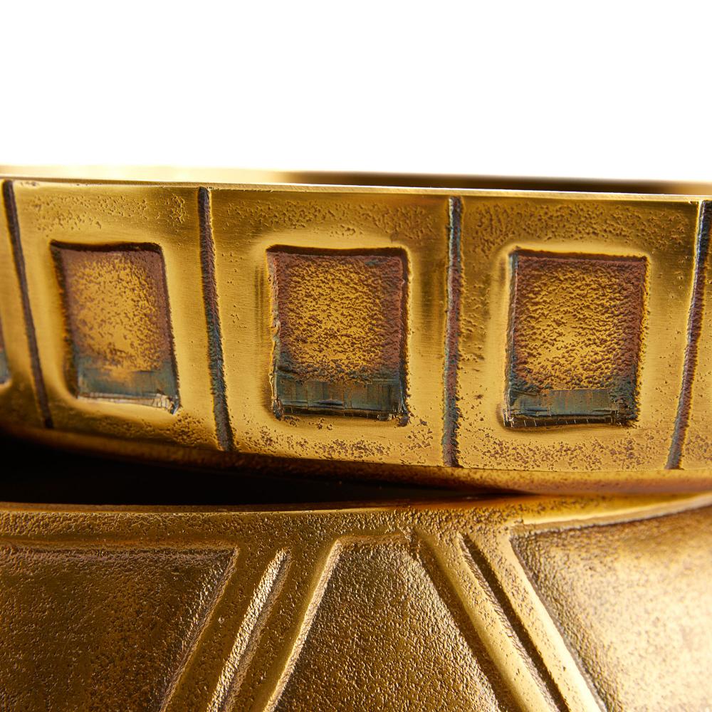 The Millenia Large Stacked Centerpieces have a visual language that combines art deco and orientalism and are rendered in cast aluminum. These timeless individual pieces are finished in antique brass and are designed to be used and displayed separately or stacked as bowls or trays. The Millenia Stacked Bowls I & II - are two individual sets for a total of 4 pieces.