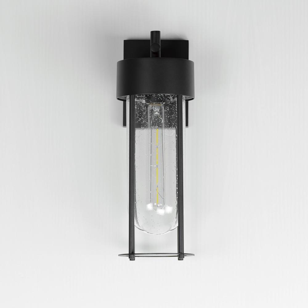 Clean and contemporary, this series of wet location rated outdoor sconces features a capsule of Clear Seeded glass encased within a cage of matte Black outdoor rated powder coat. The transitional appeal of the design pairs well in applications both modern