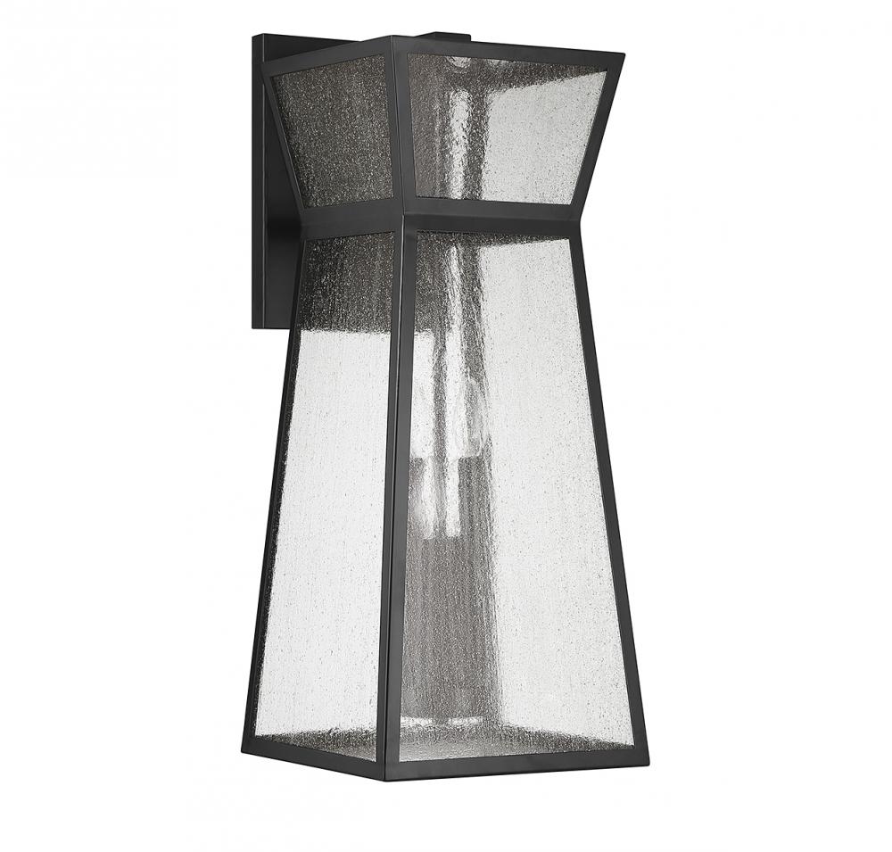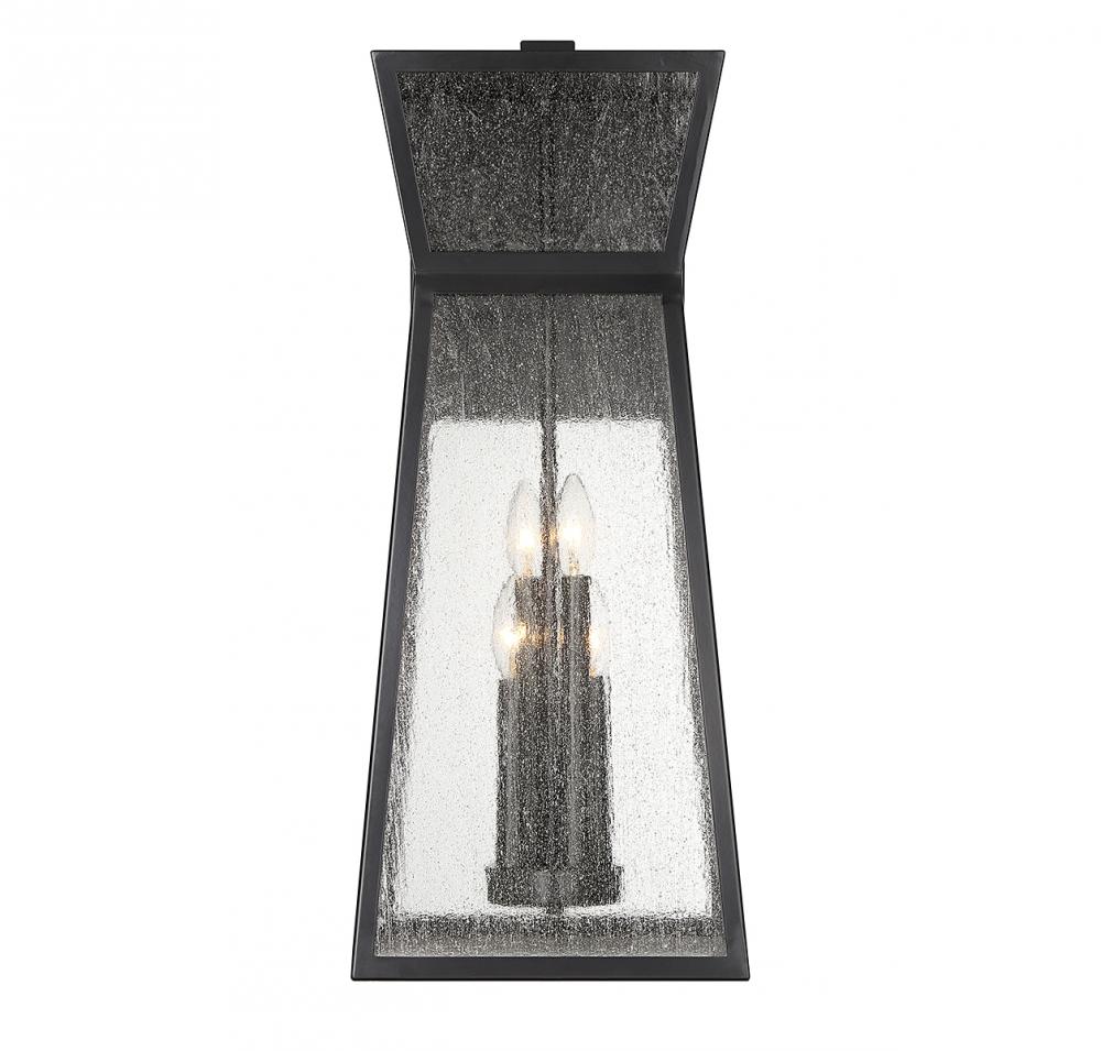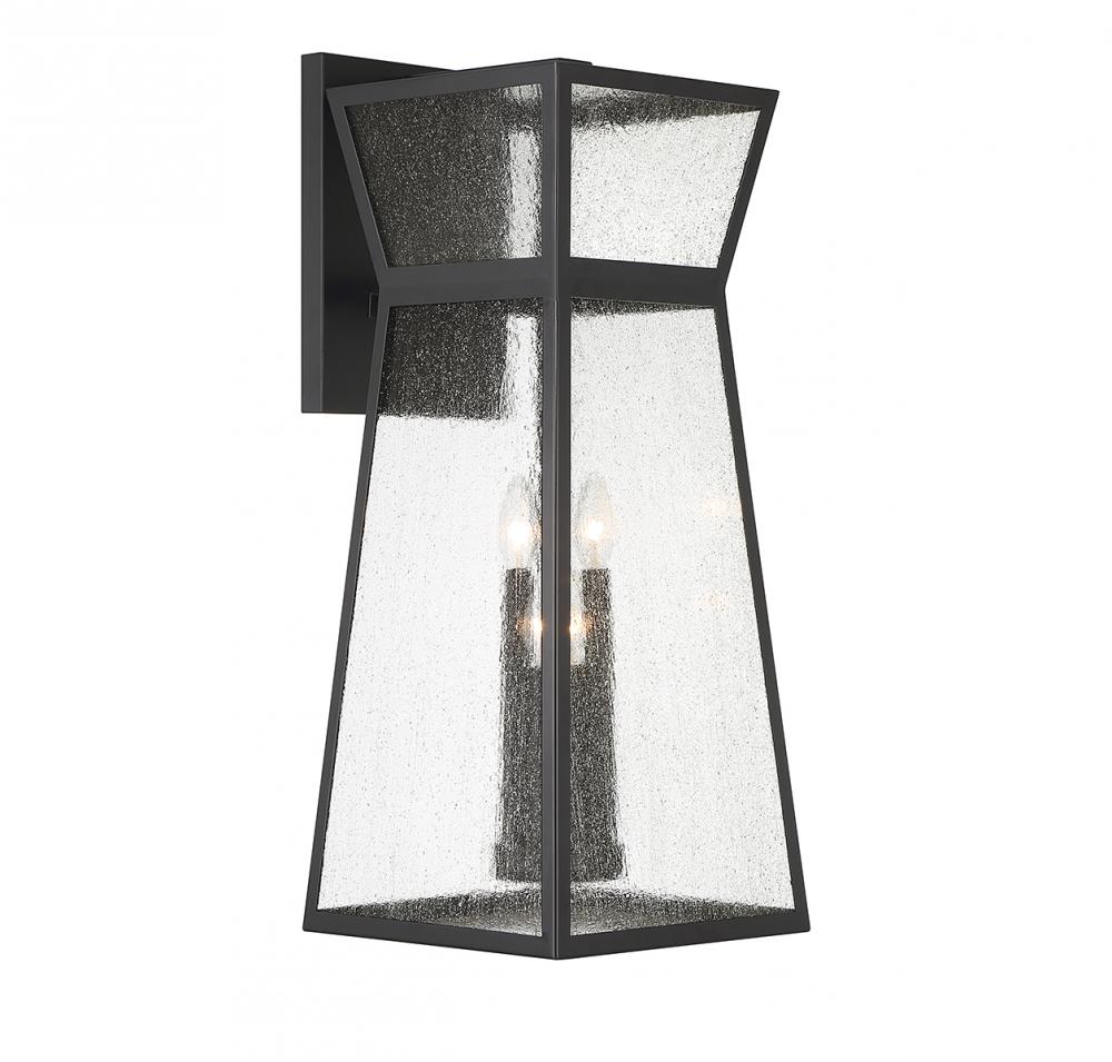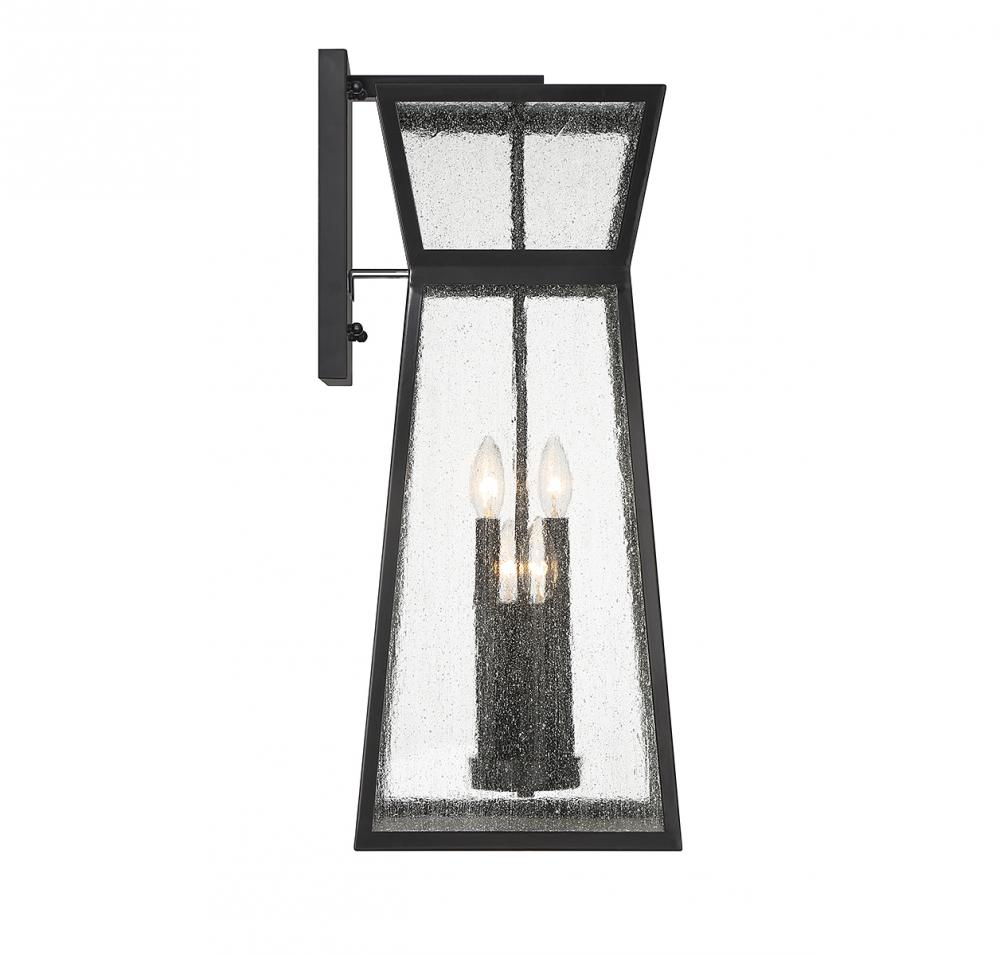 From Savoy House, the Millford 4-light outdoor wall light showcases a more contemporary take on classic lantern-style illumination with a sharply angular shape and panes of seedy glass. Matte black finish. Millford is 26.75" in height, 11" in width and extends 12.25" from the wall. It uses 4 candelabra size bulbs of up to 40 watts per bulb (bulbs not included).