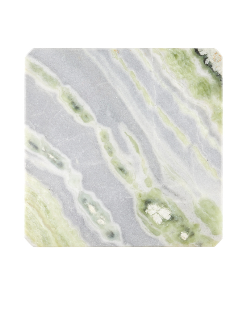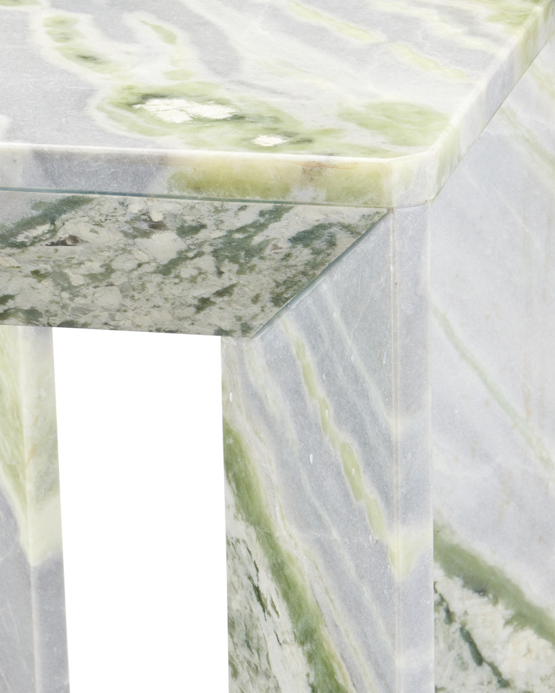 The Minerale Green Onyx Accent Table exhibits natural beauty and refined craftsmanship. Made from richly patterned green onyx, striking veins of green, gray, and beige flow along its surfaces to make each table unique. The square table has an angular design with a chamfered top that descends into a well-defined apron, a receding quality that is mirrored by its legs. At 21 inches tall, the marble table will add significant texture to its spot in a room.
