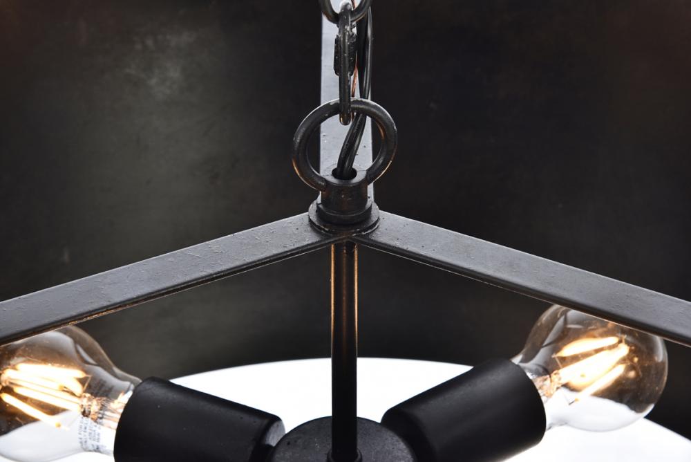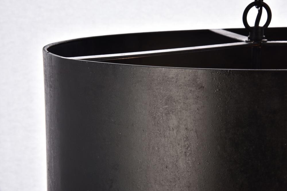 The raw power and audacious simplicity of Miro collection hanging fixtures will lend a commanding presence to your home – especially in a kitchen, living room, office, or studio space. The bold, textured cylindrical shade hangs from a rugged chain and disk-shaped mounting plate. Three exposed bulbs (Not included) hang from a hidden internal crosspiece and create a curious effect on the color of the interior. Available in a vintage-Black or manual-brass finish with two size options.