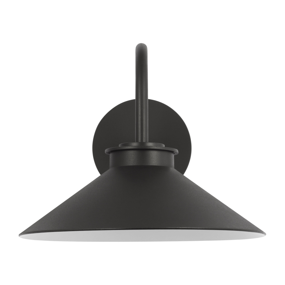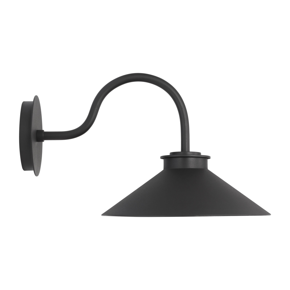 The Modern Barn Lights by Sean Lavin has a minimal silhouette and a textured Black finish, bringing a modern and industrial style to your main entrance. It's made from metal, and it hangs from a round back plate and a sleek, curved arm. The shade has a bell-shaped design that reminds us of classic barn lamps This elegant light is a beautiful and functional wall lantern with industrial accents, complementing porches, patios, and other outdoor areas.