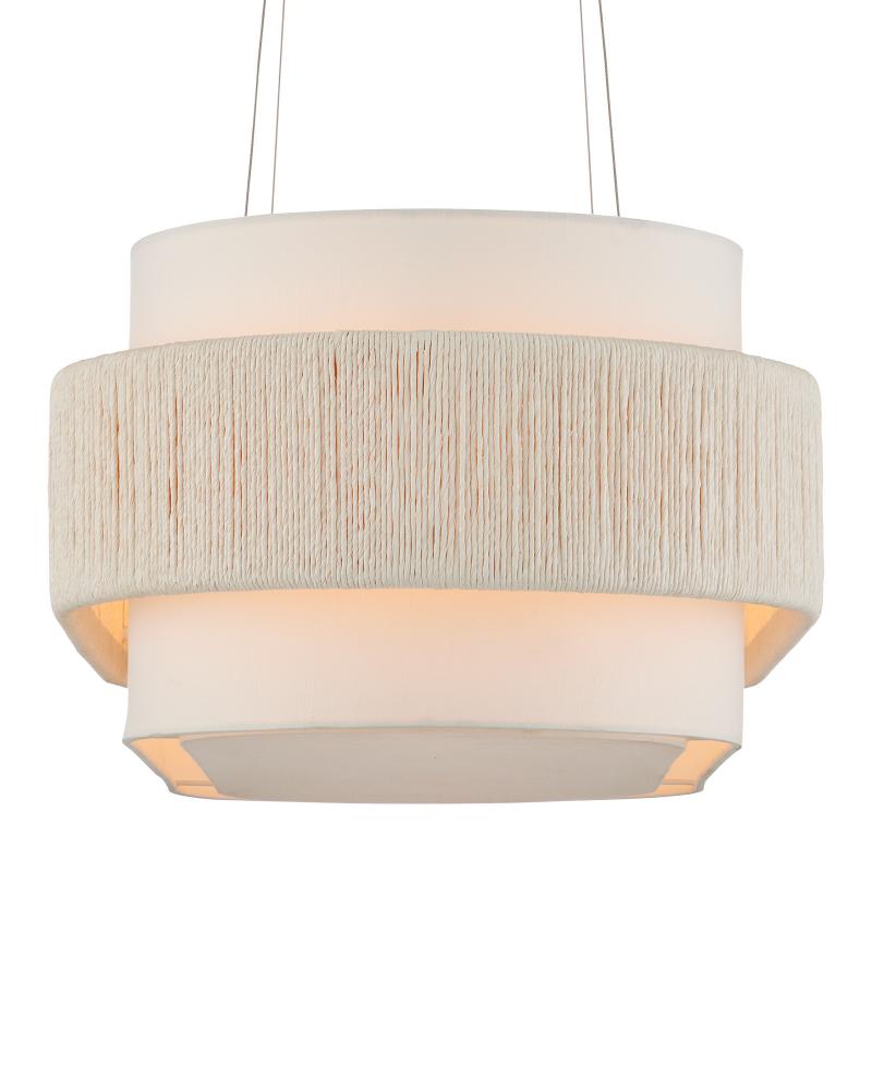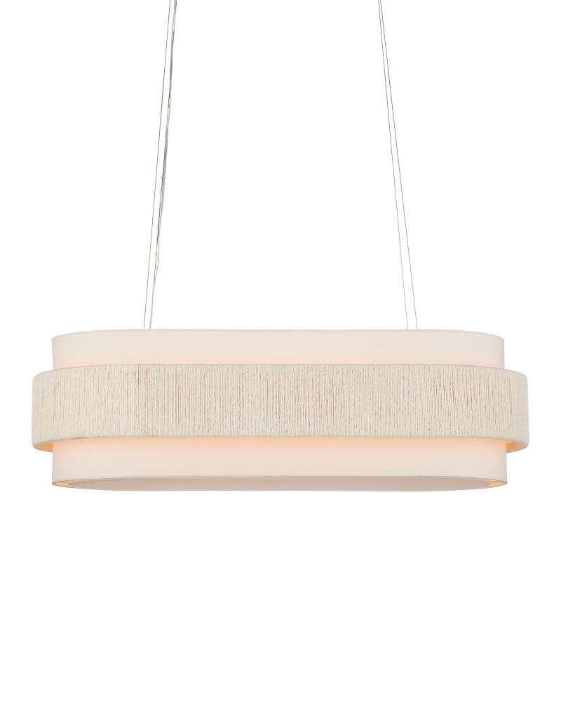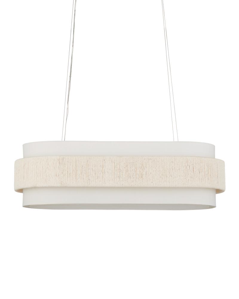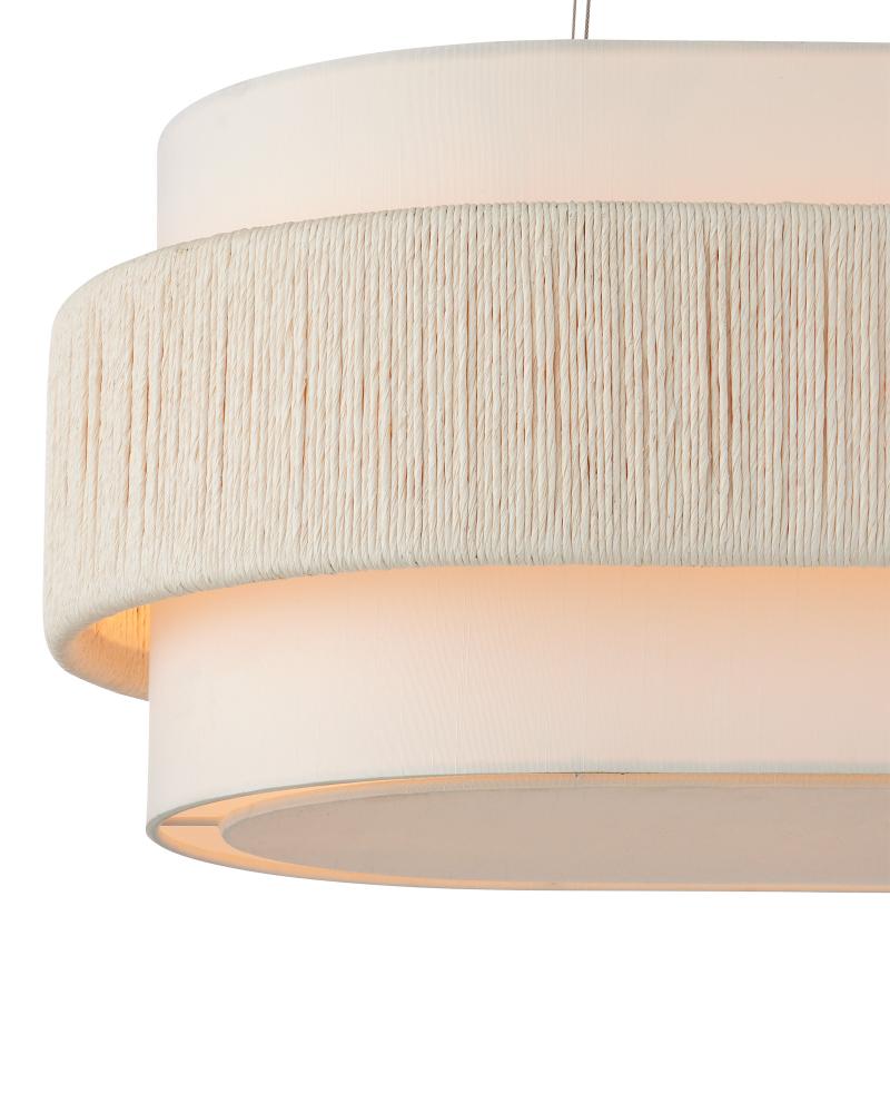 With a band made from recycled paper that has been twisted like braided hair, the Monreale Oval Chandelier has an ultra-contemporary cleanness to its design. The paper, which is painted white, is wrapped around the middle of an off-white shantung shade. The canopy is finished in a Sugar White that contributes to the lightness of this white chandelier. The bottom of the shade is fitted with a diffuser to soften the glow. Adjustable from 19.5" to 150" with use of included chain/rod kit/cable. If your space calls for a longer drop, additional chain/rods/cable is available for purchase.