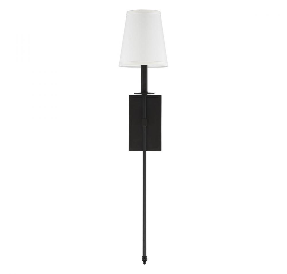This Savoy House Monroe 1-light sconce features a long sleek body, a white fabric shade and a classy, visual contemporary silhouette. Matte black finish. Sconces add a touch of style and light to any wall, including but certainly not limited to hallways, entryways, stairways, great rooms and dining rooms. You will also often see a pair of sconces flanking a bathroom vanity mirror to provide an even, flattering wash of light. Bulb not included. The matte black finish can be paired with black hardware or mixed with hardware in other finishes. Monroe is a perfect, comfortable addition to rooms of any style, especially transitional or classic. When you choose a Savoy House lighting fixture, you can be certain you’ve selected a piece that will withstand the test of time.