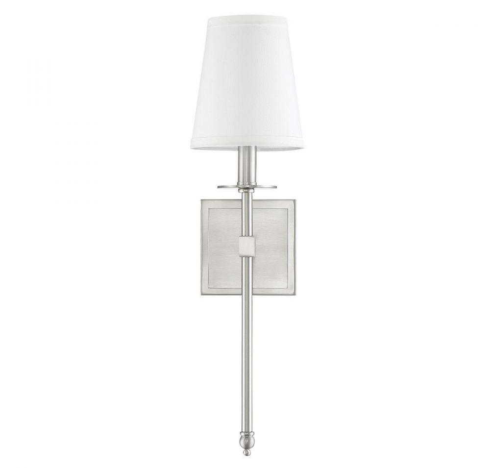This Savoy House Monroe 1-light sconce features a long sleek body, a white fabric shade and a classy, contemporary silhouette. satin nickel finish. Sconces add a touch of style and light to any wall, including but certainly not limited to hallways, entryways, stairways, great rooms and dining rooms. You will also often see a pair of sconces flanking a bathroom vanity mirror to provide an even, flattering wash of light. Bulb not included. The satin nickel finish can be paired with nickel hardware or mixed with hardware in other finishes. Monroe is a perfect addition to rooms of any style, especially transitional or classic. When you choose a Savoy House lighting fixture, you can be certain you’ve selected a piece that will withstand the test of time.