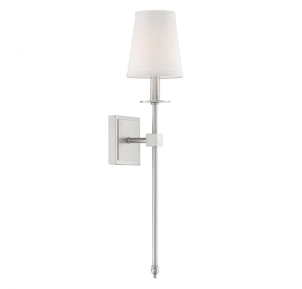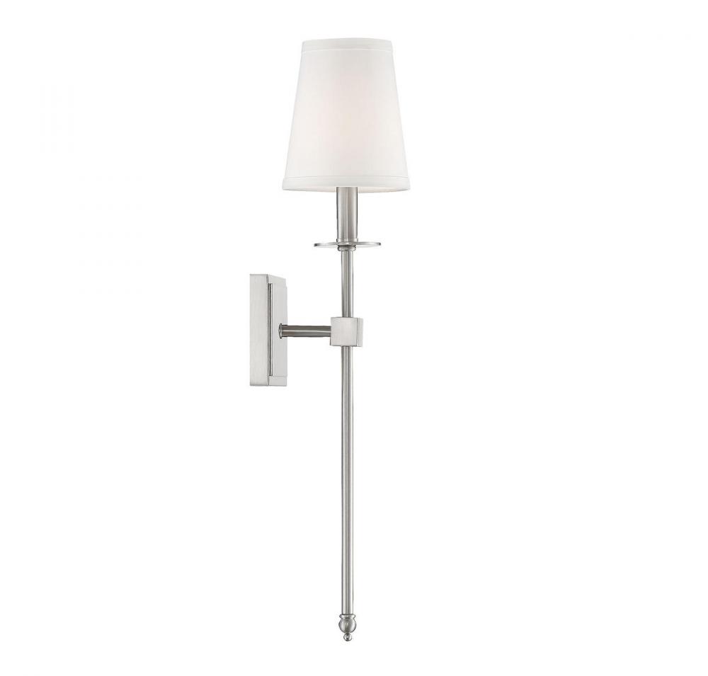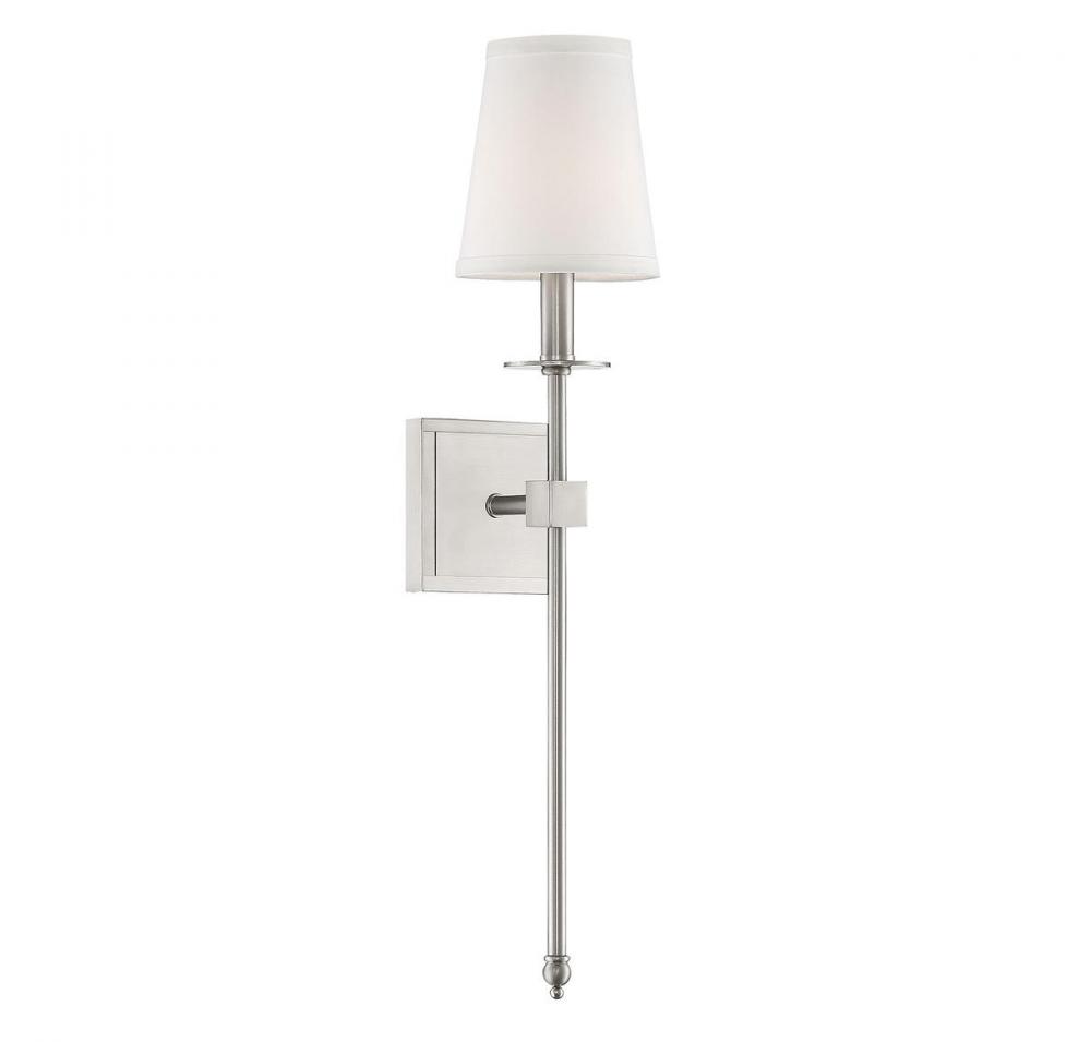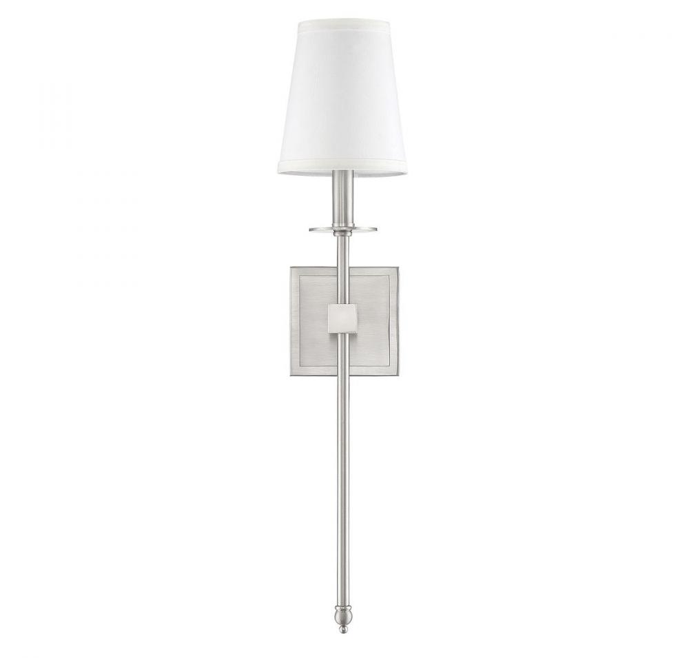 This Savoy House Monroe 1-light sconce features a long sleek body, a white fabric shade and a classy, contemporary silhouette. satin nickel finish. Sconces add a touch of style and light to any wall, including but certainly not limited to hallways, entryways, stairways, great rooms and dining rooms. You will also often see a pair of sconces flanking a bathroom vanity mirror to provide an even, flattering wash of light. Bulb not included. The satin nickel finish can be paired with nickel hardware or mixed with hardware in other finishes. Monroe is a perfect addition to rooms of any style, especially transitional or classic. When you choose a Savoy House lighting fixture, you can be certain you’ve selected a piece that will withstand the test of time.