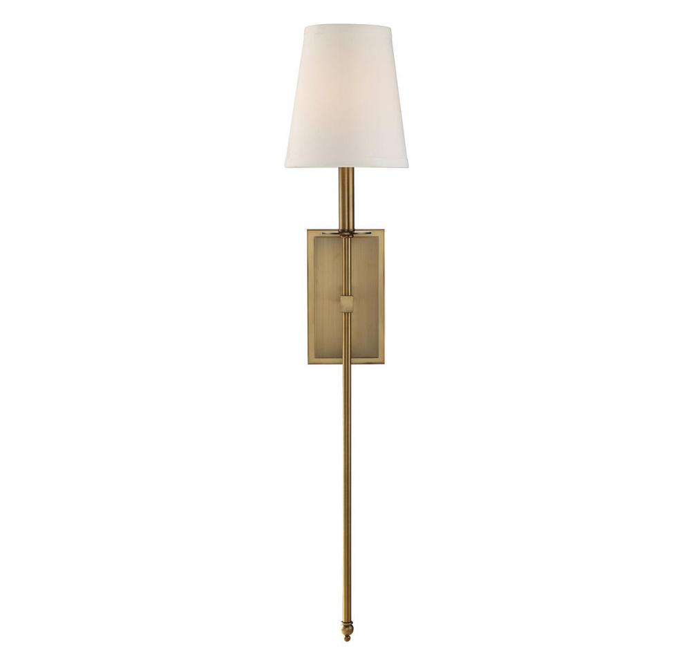 This Savoy House Monroe 1-light sconce features a long sleek body, a white fabric shade and a classy, visual contemporary silhouette. Warm brass finish. Sconces add a touch of style and light to any wall, including but certainly not limited to hallways, entryways, stairways, great rooms and dining rooms. You will also often see a pair of sconces flanking a bathroom vanity mirror to provide an even, flattering wash of light. Bulb not included. The warm brass finish can be paired with brass hardware or mixed with hardware in other finishes. Monroe is a perfect, comfortable addition to rooms of any style, especially transitional or classic. When you choose a Savoy House lighting fixture, you can be certain you’ve selected a piece that will withstand the test of time.