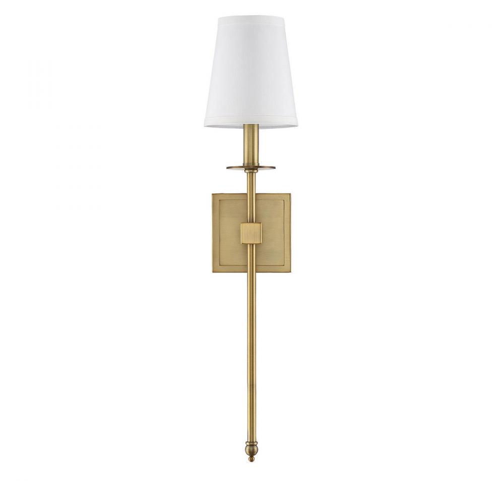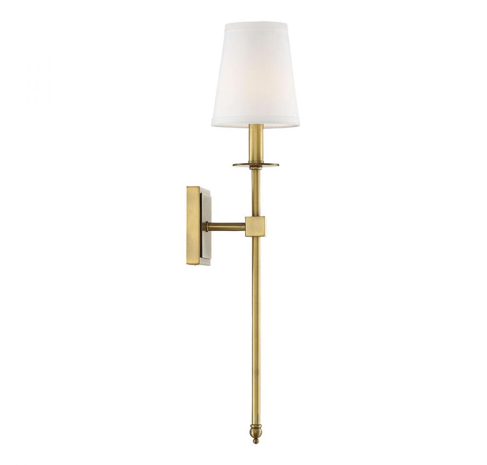 This Savoy House Monroe 1-light sconce features a long sleek body, a white fabric shade and a classy, visual contemporary silhouette. Warm brass finish. Sconces add a touch of style and light to any wall, including but certainly not limited to hallways, entryways, stairways, great rooms and dining rooms. You will also often see a pair of sconces flanking a bathroom vanity mirror to provide an even, flattering wash of light. Bulb not included. The warm brass finish can be paired with brass hardware or mixed with hardware in other finishes. Monroe is a perfect, comfortable addition to rooms of any style, especially transitional or classic. When you choose a Savoy House lighting fixture, you can be certain you’ve selected a piece that will withstand the test of time.