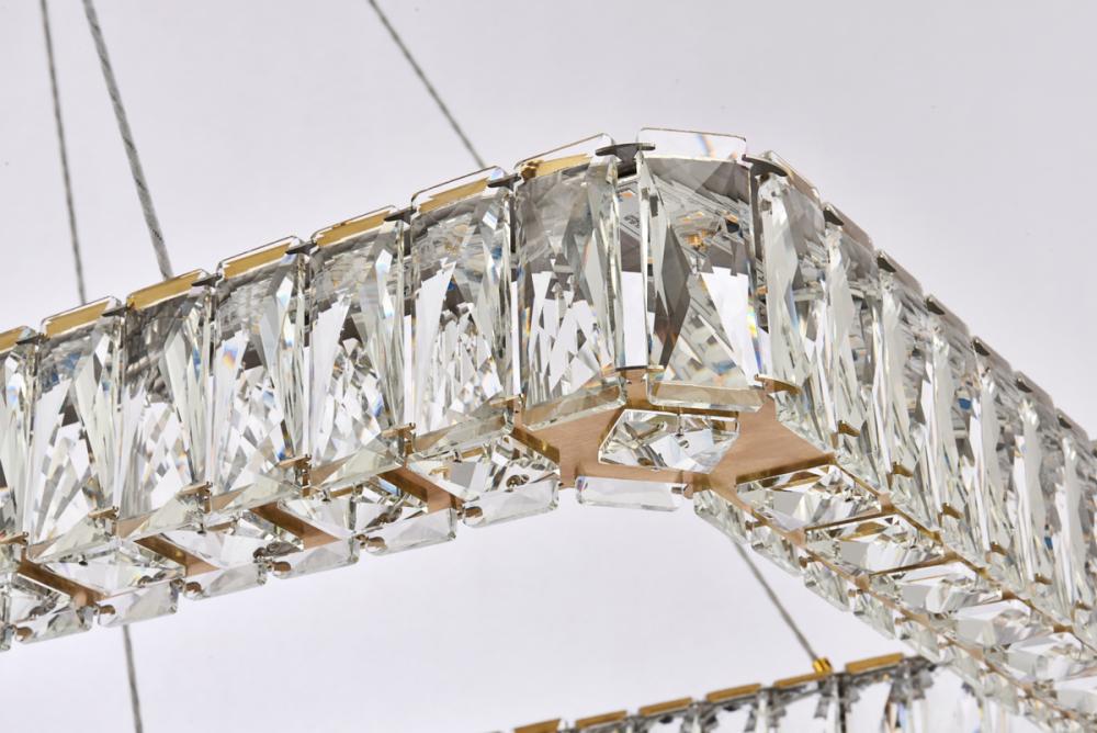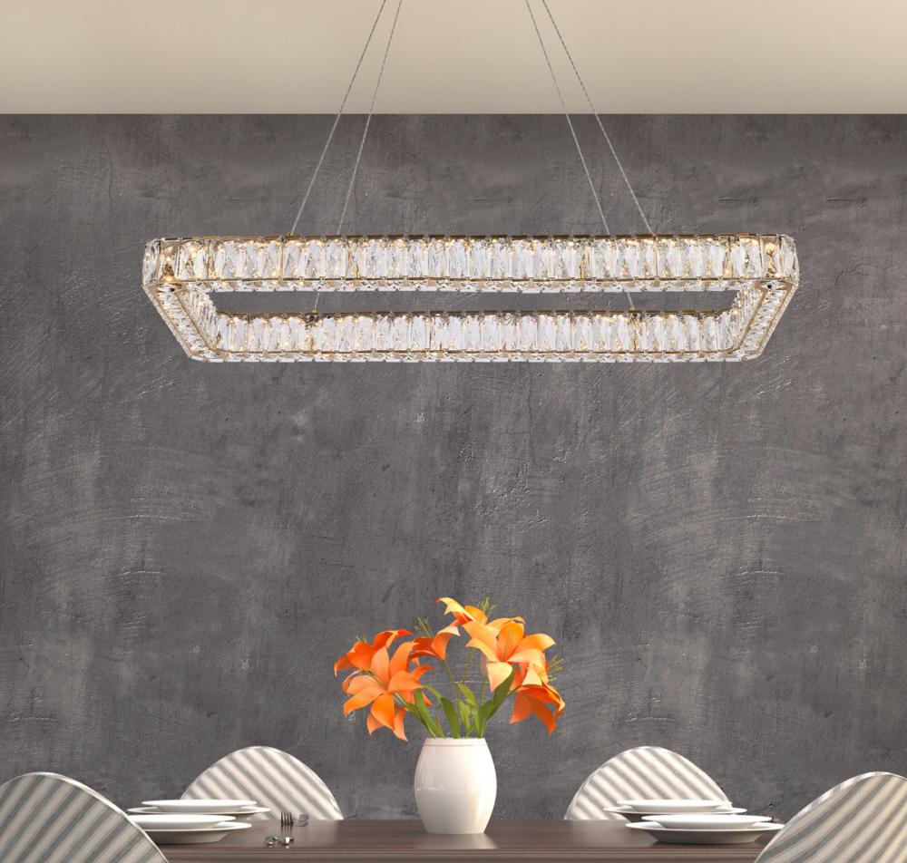 Diamonds are a girl’s best friend, and sparkling Monroe collection hanging fixtures take Marilyn’s famous lines to heart … for women and men alike. A minimal stainless-steel frame becomes dazzling when it is covered entirely with rectangular and square spectacularly faceted clear crystals. The oblong design hangs from almost invisible wires with brilliant integrated LED shining unseen from within. Stunning when placed in a dining room, kitchen, living room, or bedroom.