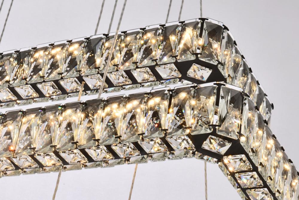 Diamonds are a girl’s best friend, and sparkling Monroe collection hanging fixtures take Marilyn’s famous lines to heart … for women and men alike. A minimal stainless-steel frame becomes dazzling when it is covered entirely with rectangular and square spectacularly faceted clear crystals. The oblong design hangs from almost invisible wires with brilliant integrated LED shining unseen from within. Stunning when placed in a dining room, kitchen, living room, or bedroom.