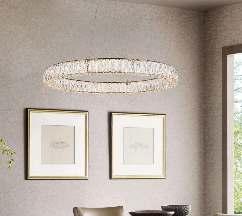 Diamonds are a girl’s best friend, and sparkling Monroe collection hanging fixtures take Marilyn’s famous lines to heart … for women and men alike. A minimal stainless-steel frame in a smooth gold finish becomes dazzling when it is covered entirely with rectangular and square spectacularly faceted royal-cut clear crystals. The oblong design hangs from almost invisible wires with brilliant integrated LED shining unseen from within. Stunning when placed in a dining room, kitchen, living room, or bedroom.