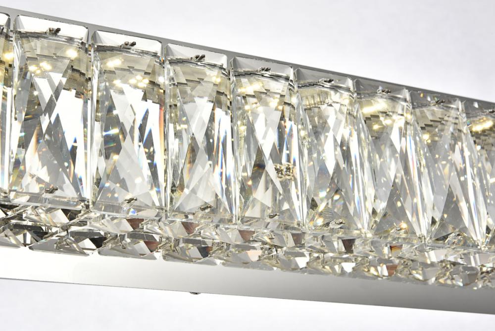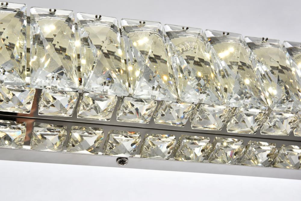 Monroe collection wall sconces dress up a bathroom, office, or bedroom without overwhelming the surrounding décor. A rectangular stainless-steel frame and backplate would seem austere if it weren’t covered by a row of shining rectangular royal-cut clear crystals. The chrome-finished backplate is polished to a mirror shine and reflects the glittering crystals for additional sparkle. Available in three size options with a sleek chrome finish that completes this modern look.