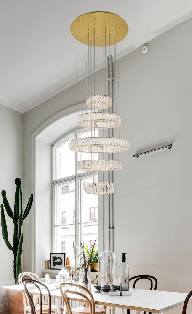 Diamonds are a girl’s best friend, and sparkling Monroe collection hanging fixtures take Marilyn’s famous lines to heart … for women and men alike. A minimal stainless-steel frame in a smooth gold finish becomes dazzling when it is covered entirely with rectangular and square spectacularly faceted royal-cut clear crystals. The oblong design hangs from almost invisible wires with brilliant integrated LED shining unseen from within. Stunning when placed in a dining room, kitchen, living room, or bedroom.