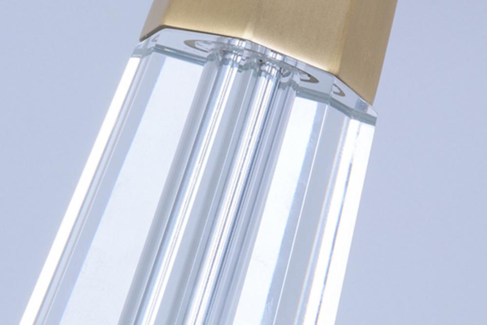 The sleek Monroe lamp pairs a crystal column with brass accents. Ideal for any decor, its faceted base and white linen drum shade balance style and light. This glass lamp adds space and sparkle, catching daylight and shining when lit.