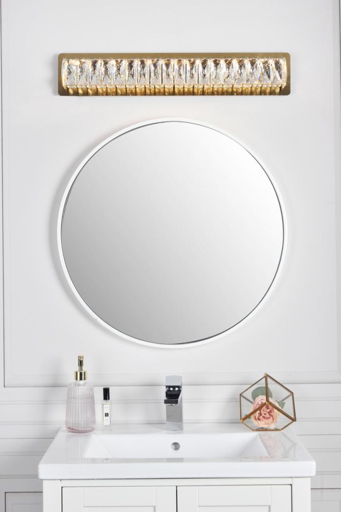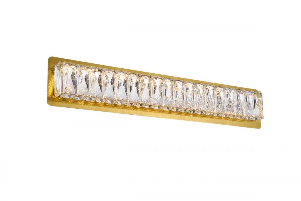 Monroe collection wall sconces dress up a bathroom, office, or bedroom without overwhelming the surrounding décor. A rectangular stainless-steel frame and backplate would seem austere if it weren’t covered by a row of shining rectangular royal-cut clear crystals. The gold-finished backplate is polished to a mirror shine and reflects the glittering crystals for additional sparkle. Available in three size options with a sleek gold finish that completes this modern look.