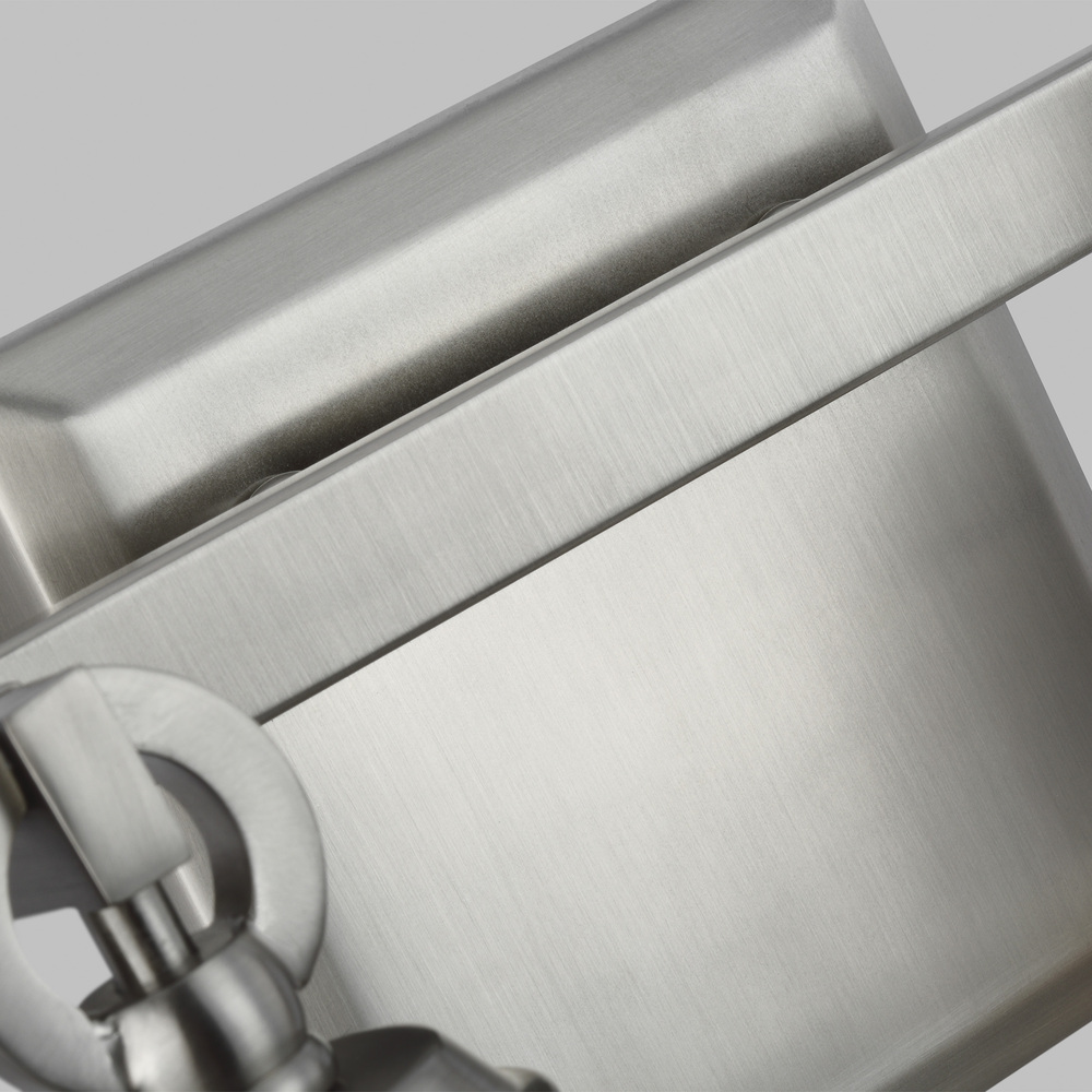The Sean Lavin Monterro two light vanity fixture in satin nickel offers shadow-free lighting in your powder room, spa, or master bath room. Monterro features beautiful tapered glass shades and exquisite cast details, including a cast backplate, cast ring, and hook hardware that elegantly supports the shades. The Chrome version is available with two glass options; either White Opal Etched glass or Clear Seeded glass, while the Burnished Brass, Satin Nickel finish is available in Clear Seeded glass only.