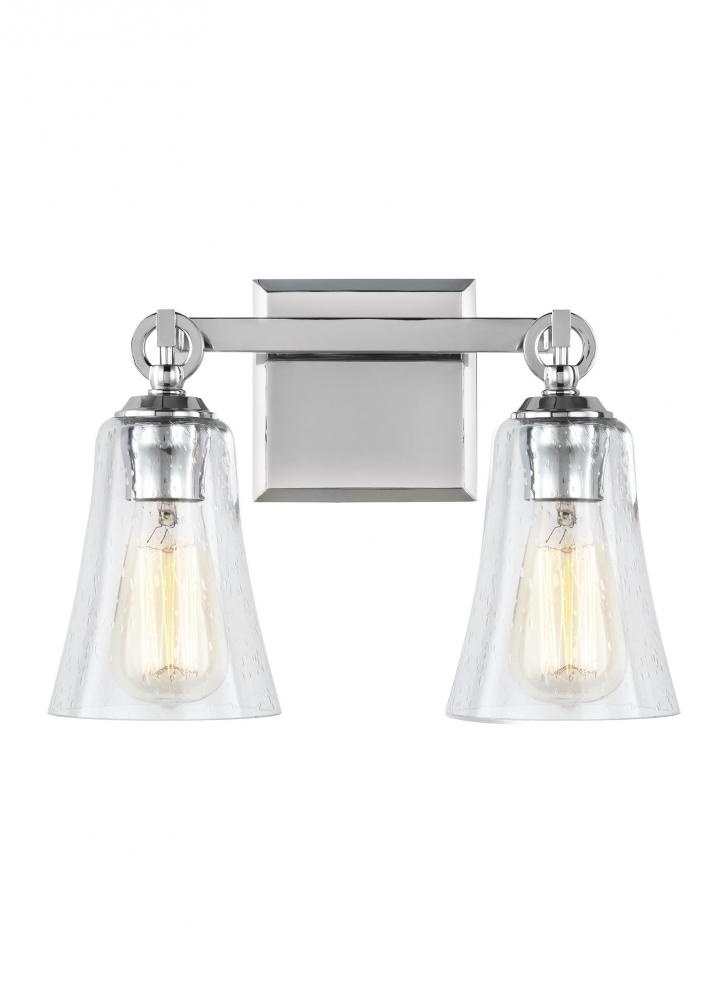 The Sean Lavin Monterro two light vanity fixture in chrome offers shadow-free lighting in your powder room, spa, or master bath room. Monterro features beautiful tapered glass shades and exquisite cast details, including a cast backplate, cast ring, and hook hardware that elegantly supports the shades. The Chrome version is available with two glass options; either White Opal Etched glass or Clear Seeded glass, while the Burnished Brass, Satin Nickel finish is available in Clear Seeded glass only.