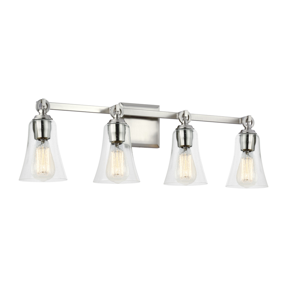 The Sean Lavin Monterro four light vanity fixture in satin nickel provides abundant light for your bath vanity, while adding a layer of today's style to your interior design. Monterro features beautiful tapered glass shades and exquisite cast details, including a cast backplate, cast ring, and hook hardware that elegantly supports the shades. The Chrome version is available with two glass options; either White Opal Etched glass or Clear Seeded glass, while the Burnished Brass, Satin Nickel finish is available in Clear Seeded glass only.