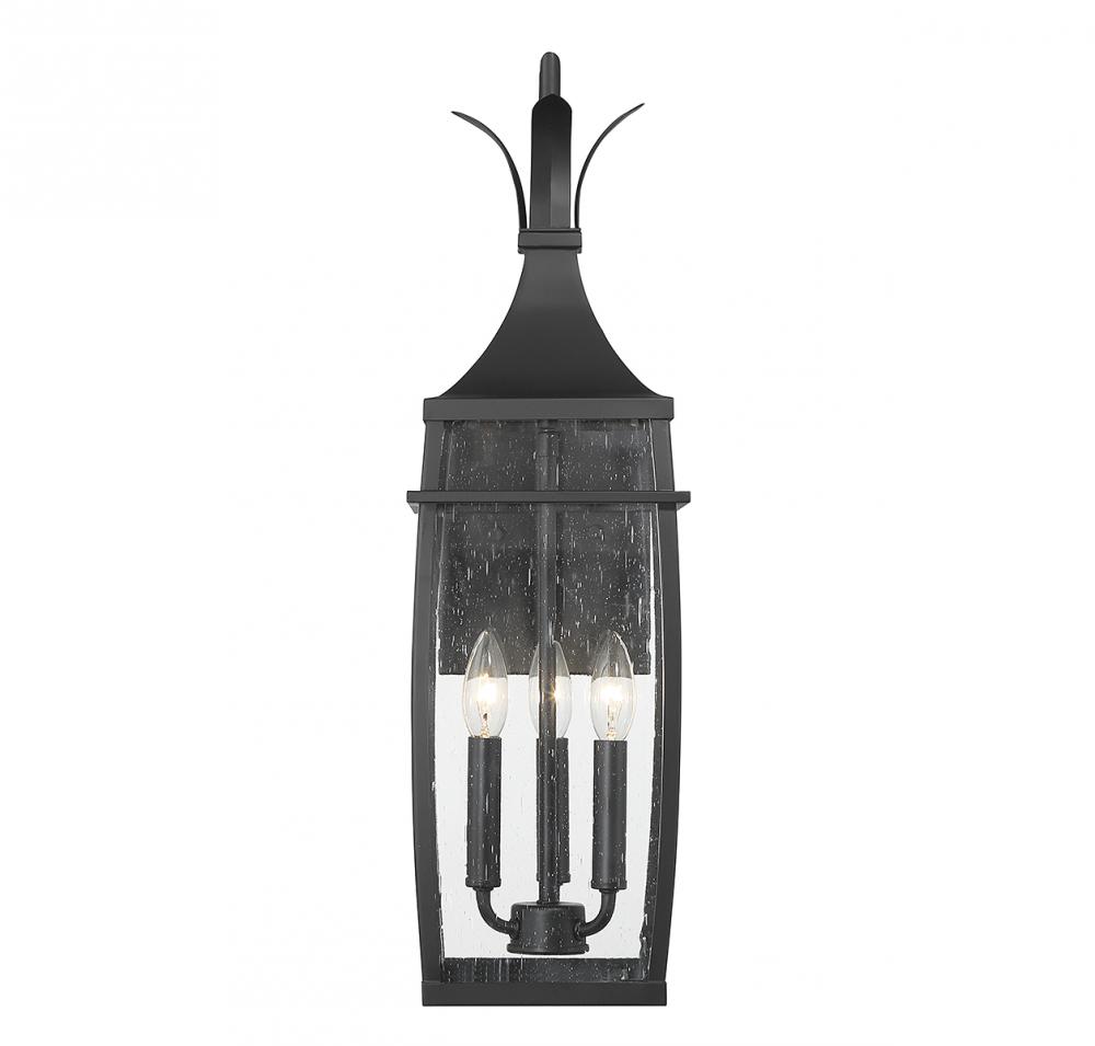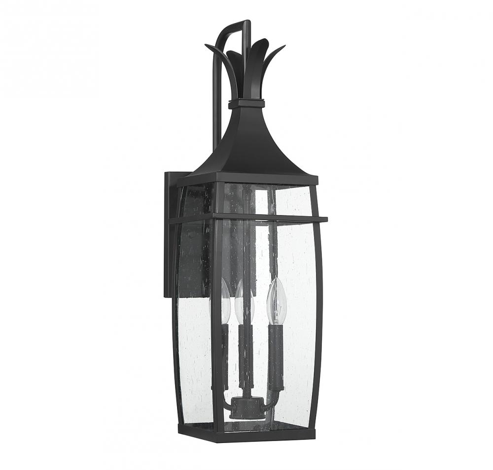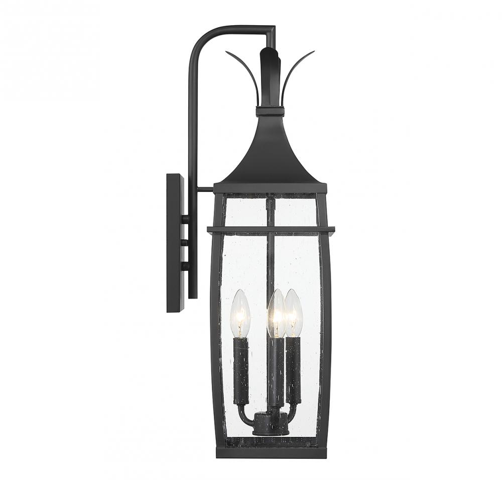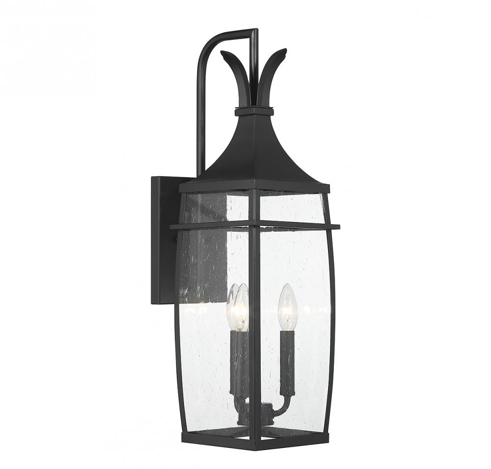 A hint of nature-inspired detailing decorates the top of this Savoy House Montpelier 3-light outdoor wall light. Its slightly curved structure features panes of clear seeded glass and is finished in a classic matte black. Montpelier is 25" in height, 7.5" in width and extends 10" from the wall. It uses 3 candelabra size bulbs with a max of 40 watts per bulb (bulbs not included).