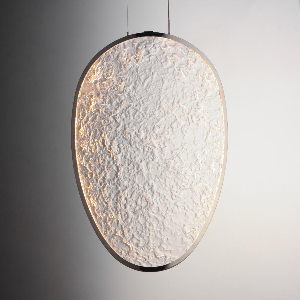A triumph of scale, craft, and light, Moonscapes transforms celestial inspiration into a breathtaking installation. Monumental in form yet ethereal in presence, each irregularly shaped panel evokes the cratered terrain of the lunar surface with dramatic te