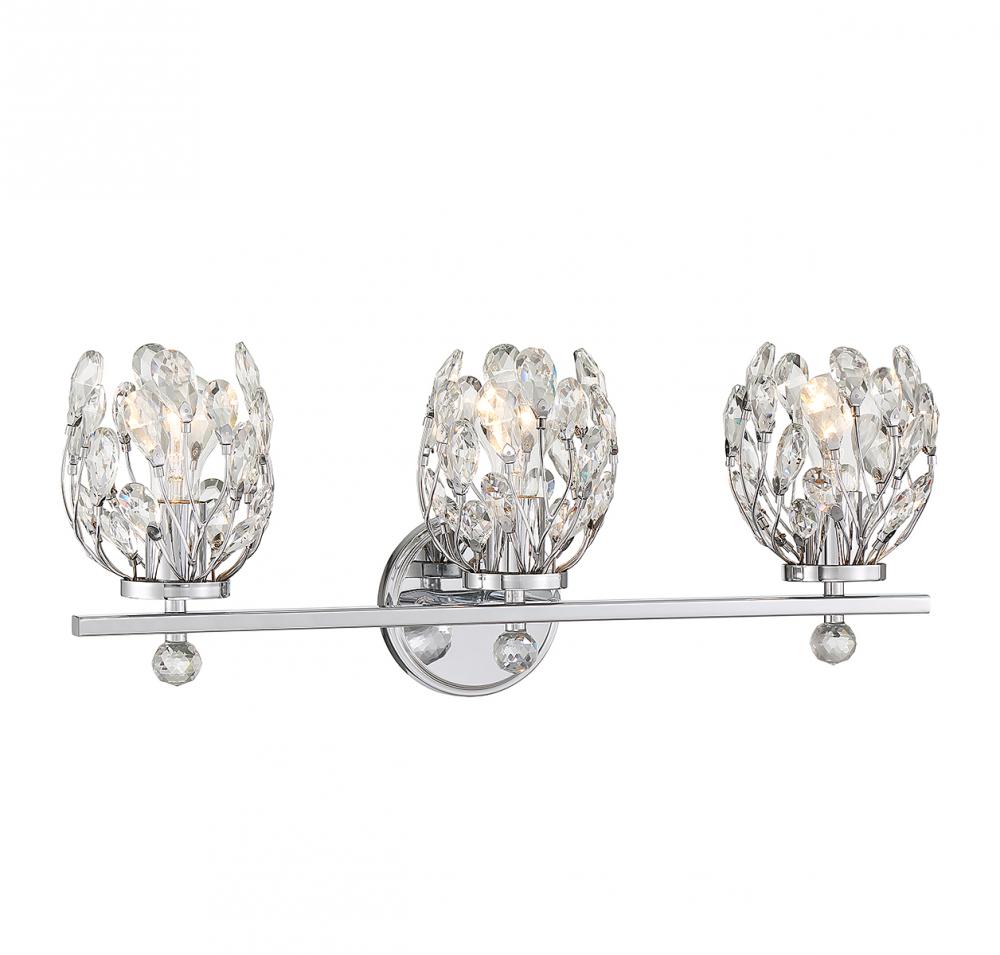 Give your bathroom its flowers with the whimsical Savoy House Moreno 3-light bath vanity light. Metal stems topped with clear crystal buds surround each light to create a look that is always fresh and fun, whether the lights are on or off. Finished in chrome. Moreno is 9.5" in height, 23.5" in width and extends 6.75" from the wall. It uses 3 standard size bulbs of up to 60 watts per bulb (bulbs not included).