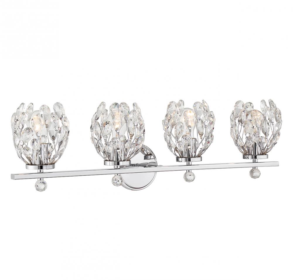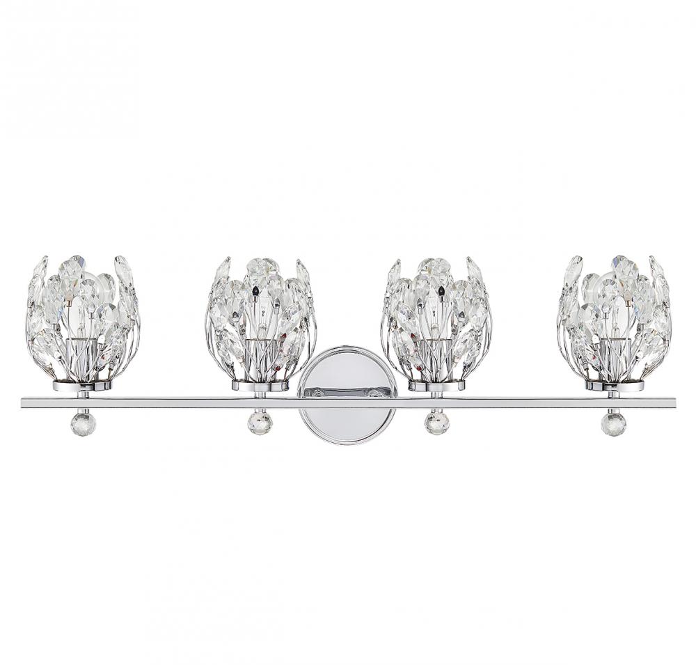 Give your bathroom its flowers with the whimsical Savoy House Moreno 4-light bath vanity light. Metal stems topped with clear crystal buds surround each light to create a look that is always fresh and fun, whether the lights are on or off. Finished in chrome. Moreno is 9.5" in height, 31" in width and extends 6.75" from the wall. It uses 4 standard size bulbs of up to 60 watts per bulb (bulbs not included).