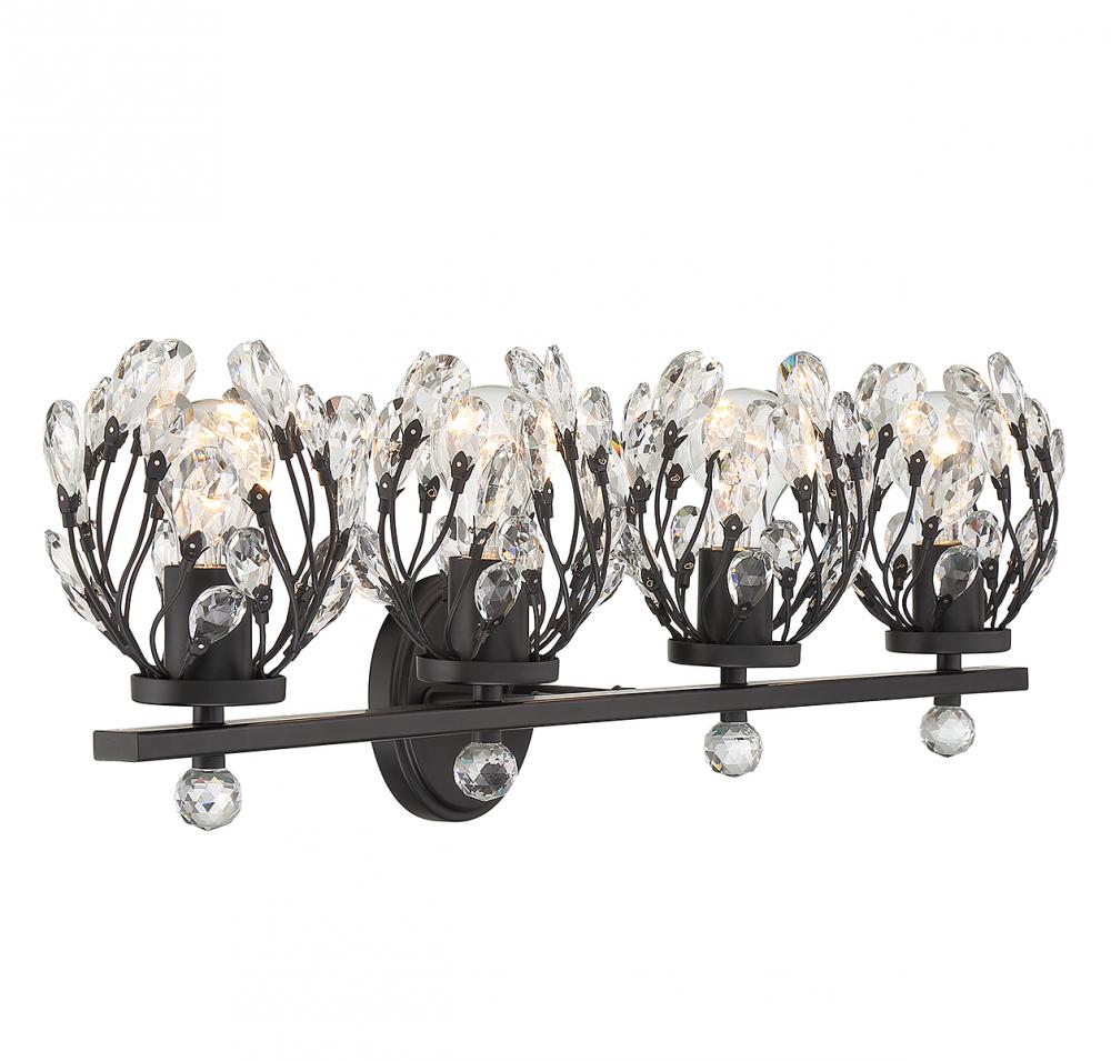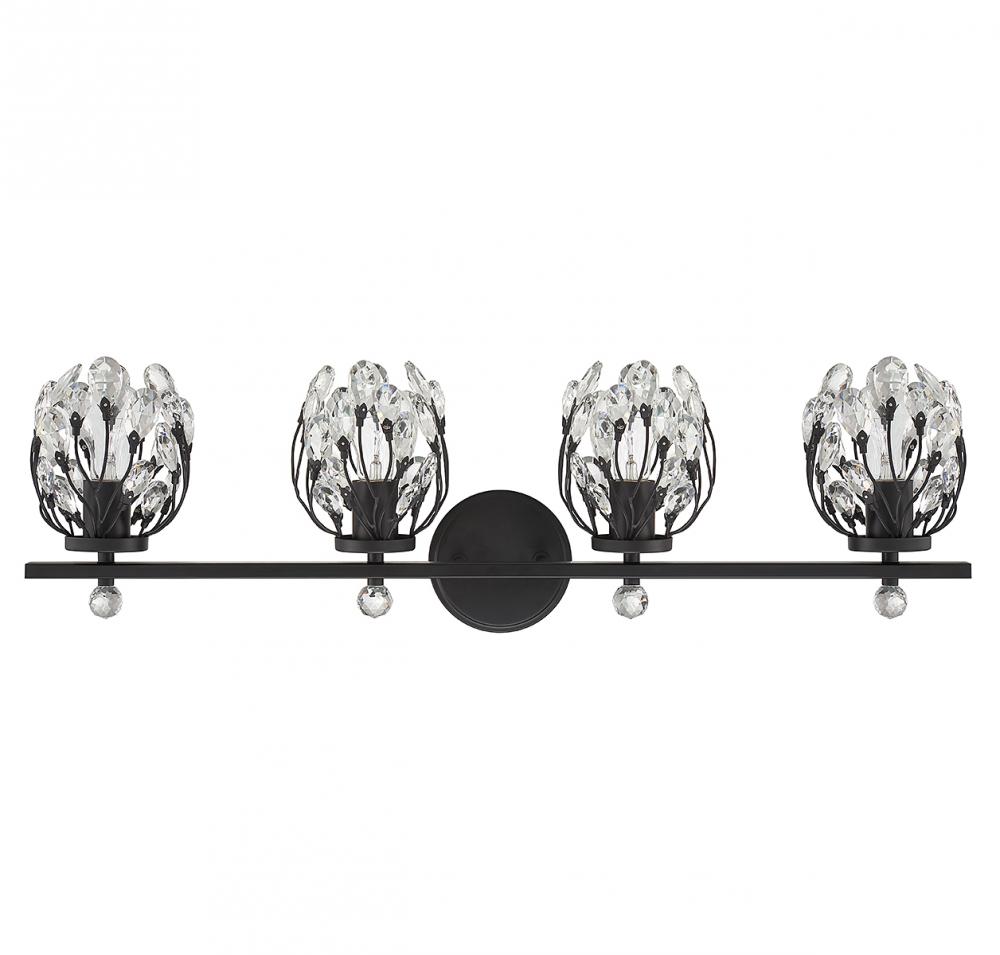 Give your bathroom its flowers with the whimsical Savoy House Moreno 4-light bath vanity light. Metal stems topped with clear crystal buds surround each light to create a look that is always fresh and fun, whether the lights are on or off. Finished in matte black. Moreno is 9.5" in height, 31" in width and extends 6.75" from the wall. It uses 4 standard size bulbs of up to 60 watts per bulb (bulbs not included).