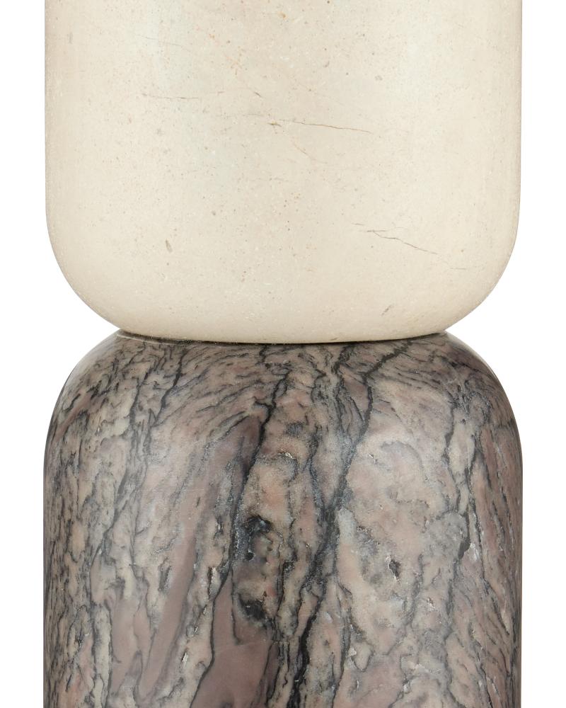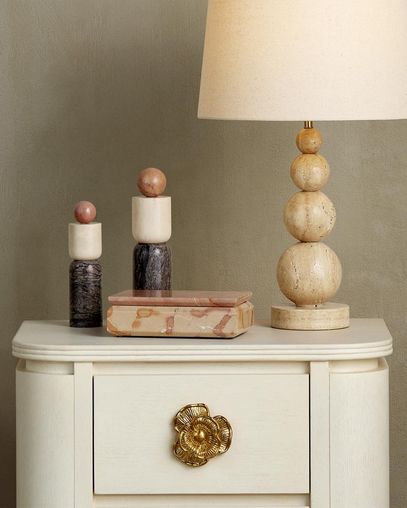 The Moreno Marble Objects Set includes two sculptures made of Rosa Cappuccino Marble, Camello Neve Marble, and Breccia Marble. The geometric sculptural pieces have tremendous personality because of the veining on two of the marbles, and the fact that the dynamic surfaces of the black and pink marbles contrast the pale softness of the other. The surfaces of the objects will vary from piece to piece, given the sculptures are made of natural stone.