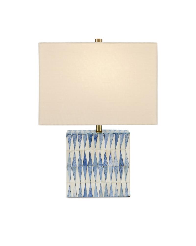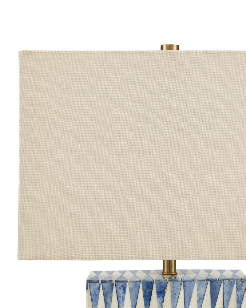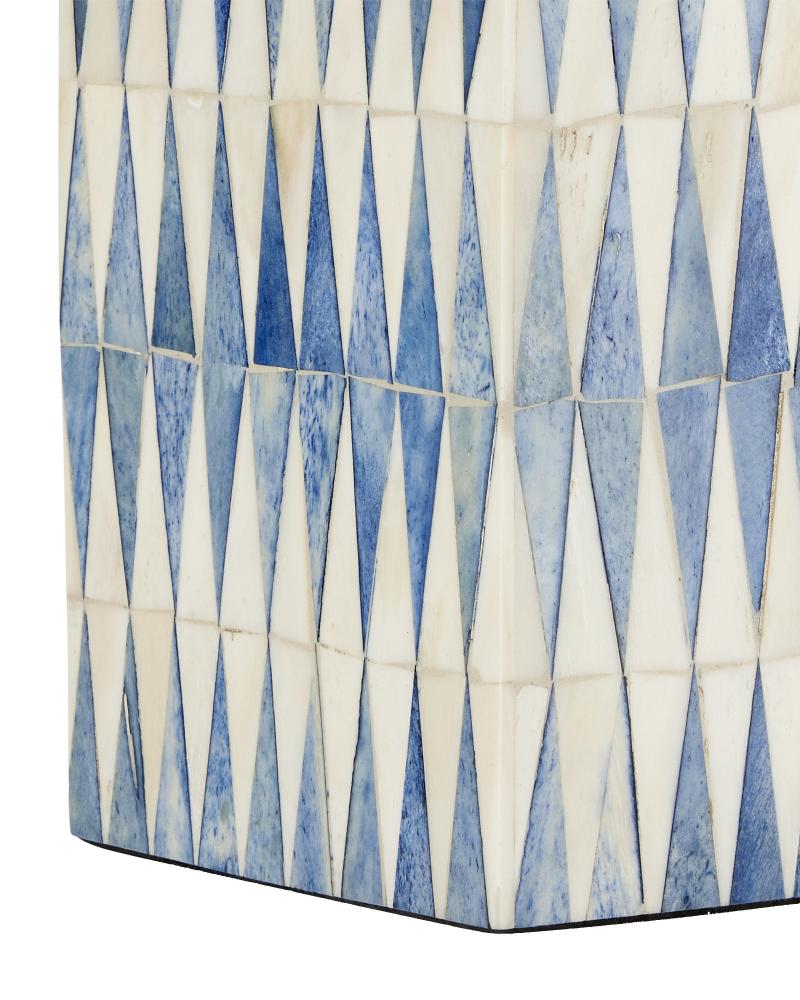 The Nadene Blue & White Table Lamp is a decorative table lamp made of alternating colors of bone. The jagged pattern is created when blue and ivory bone are hand-applied to the surface, making the blue table lamp an artisanal accent that packs a textural punch. The generous size of its rectangular shade made of light beige linen adds to the sophistication of the square lamp's profile. This complex composition brings both artistry and elegance to any space.