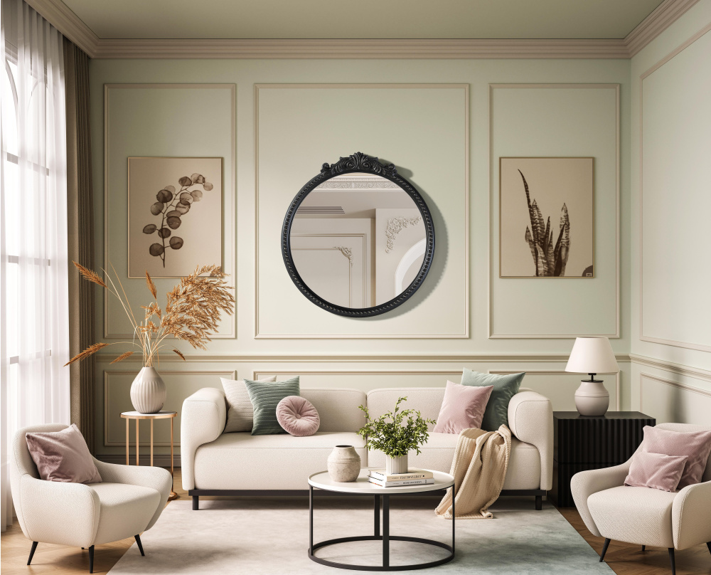 The circular frame is accented with an ornate floral and scroll crest, adding a refined, vintage-inspired touch.