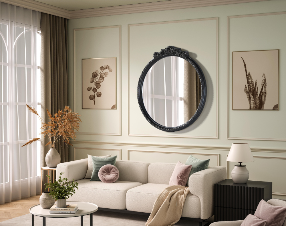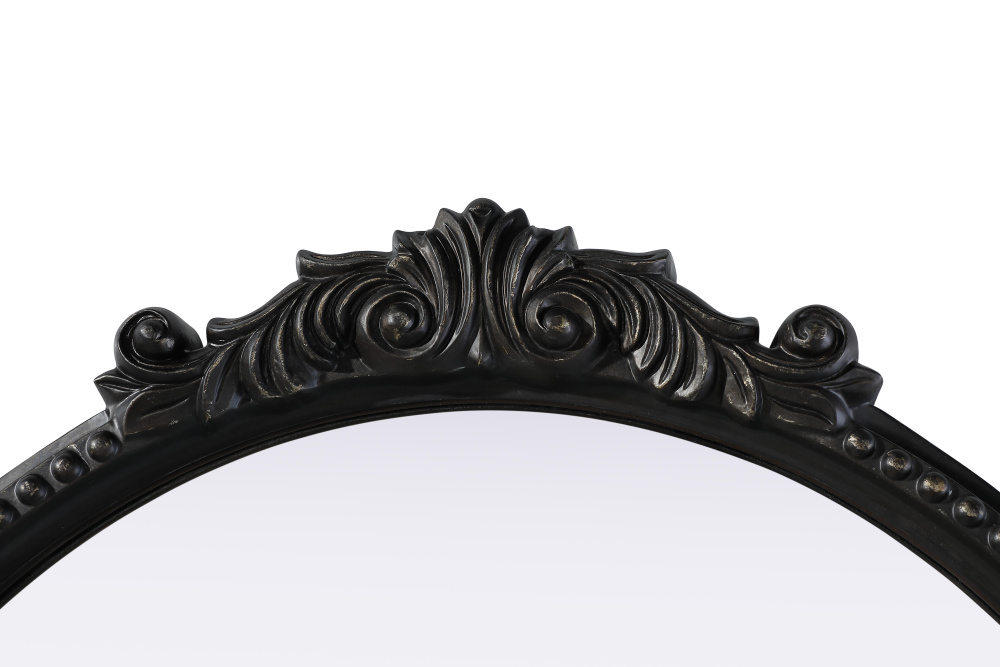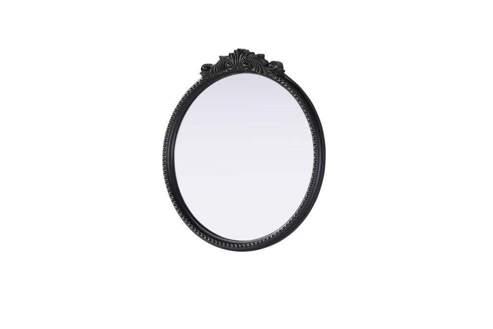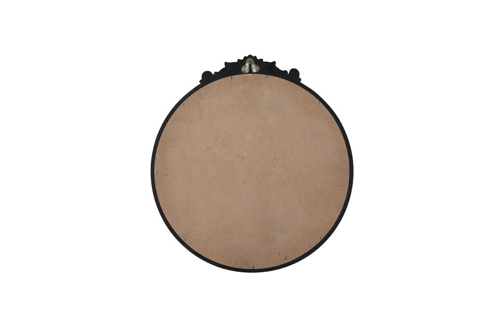 Bring vintage charm and refined craftsmanship to your space with this round wall mirror in a distressed vintage bronze finish. The hand-painted frame showcases ornate scroll and floral detailing, creating a timeless, old-world aesthetic. The beaded trim along the edge enhances the decorative appeal, making it an eye-catching statement piece. Crafted from resin with an MDF backing board, this mirror is lightweight yet durable. Designed for vertical hanging only, it includes a metal inset hanger for easy installation (hardware not included). Available in multiple sizes and an alternative antique brass finish, this mirror is perfect for vanity stations, bathrooms, entryways, or living rooms, adding architectural beauty and a sophisticated touch to any space.