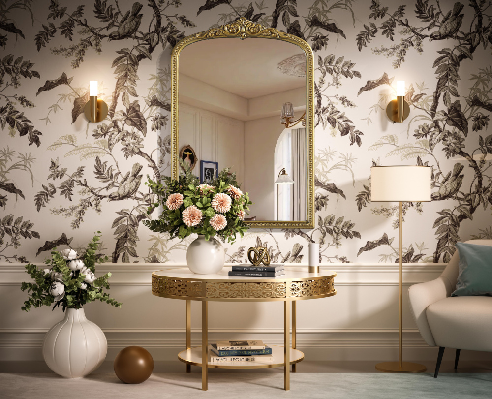 The mirror features a softly curved arch at the top, adding a refined and timeless touch to any space.