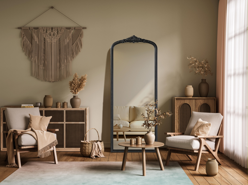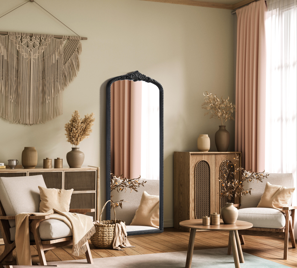 The tall, arched silhouette creates a striking focal point, perfect for full-body reflections and enhancing room depth.
